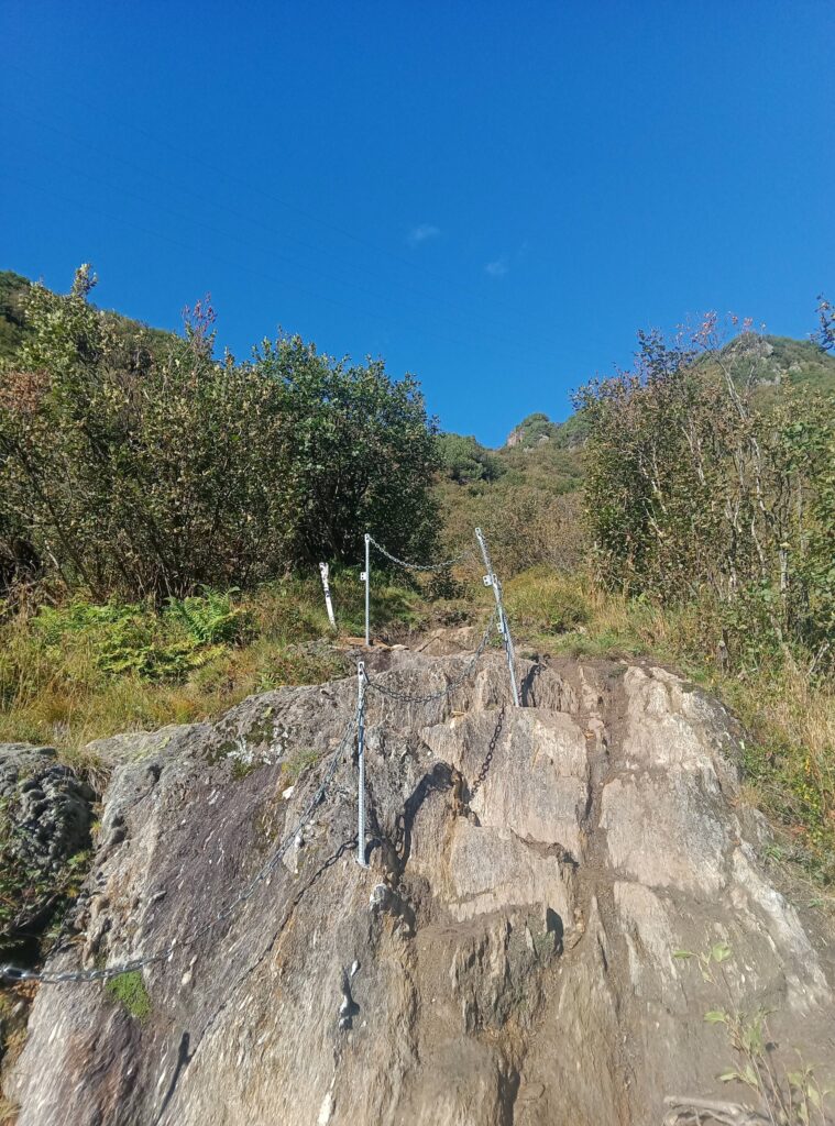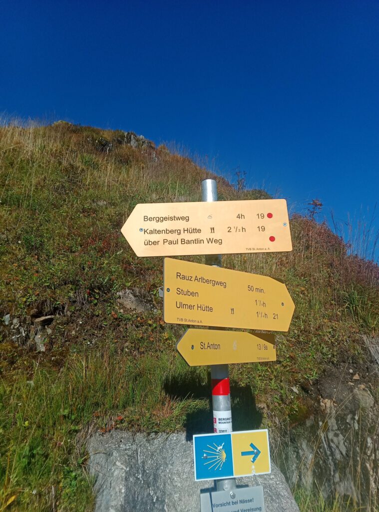 Los geht es nach der Anfahrt direkt an der Arlberg-Passstraße, der ich zunächst einige Meter nach St. Christoph am Arlberg folge. Etwas unterhalb der Passhöhe zweigt im Ort der Anstieg zur Kaltenberghütte ab. Dieser führt in westlicher Richtung zunächst kurz etwas steiler ansteigend hinauf. Über teilweise sumpfige Wege und eine kurze, versicherte (aber sehr einfache) Stufe wird eine Wegteilung erreicht.