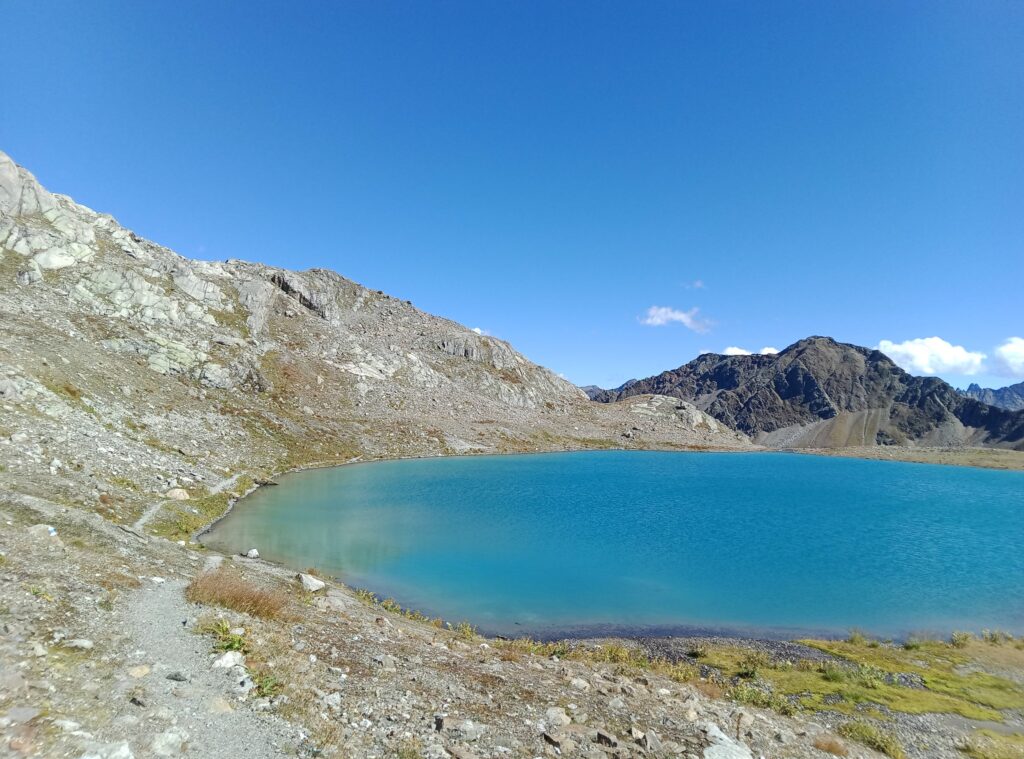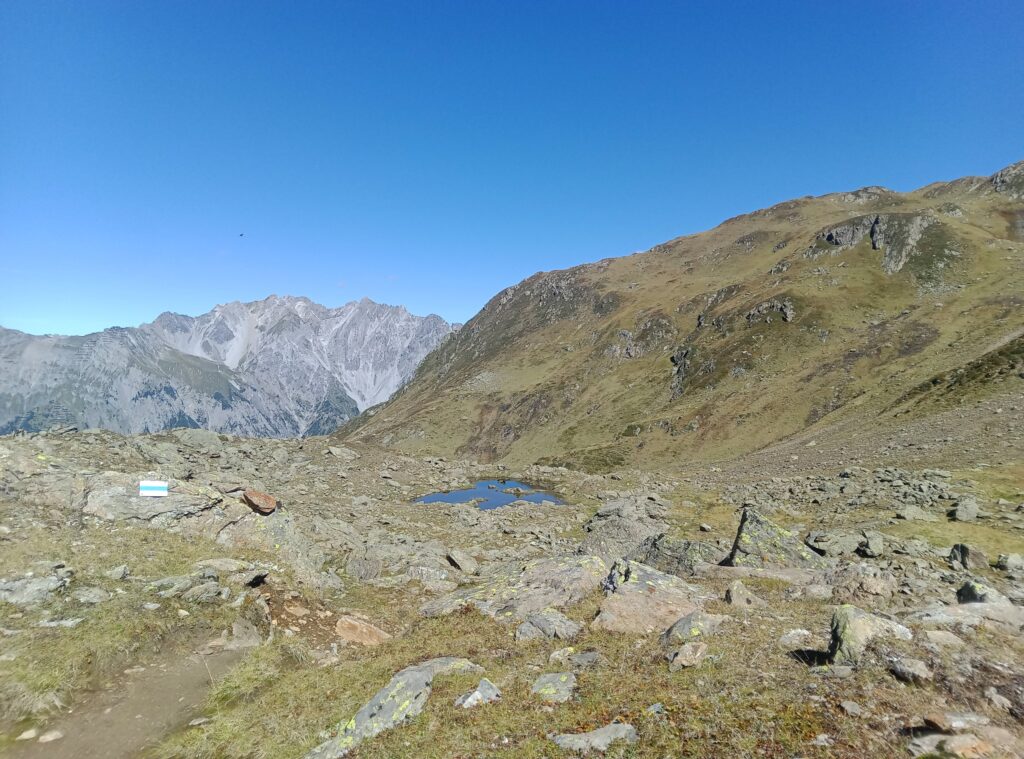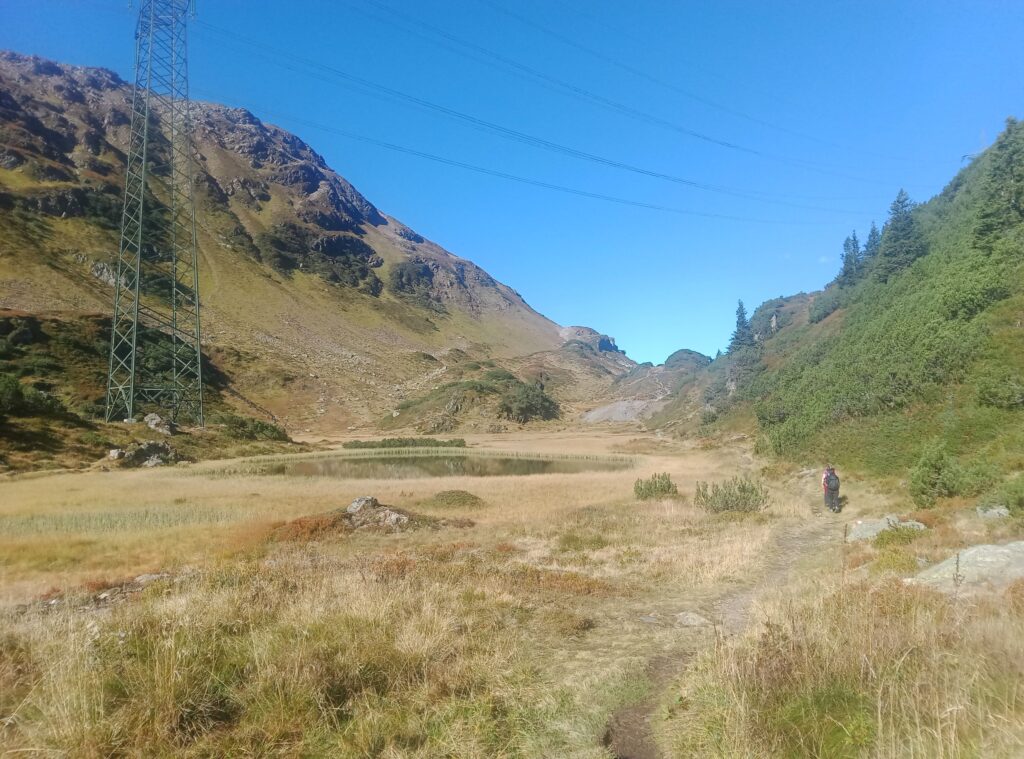 Hier kann man zwischen Berggeistweg und Paul-Bantlin-Weg wählen, die beide zur Kaltenberghütte führen. Da ich noch einen längeren Weg vor mir hatte wählte ich den letzteren, da dieser gut eine Stunde kürzer ist und einige Höhenmeter spart. Der Paul-Bantlin-Weg führt weiter nach Westen durch ein flaches Hochtal mit mehreren Seen.