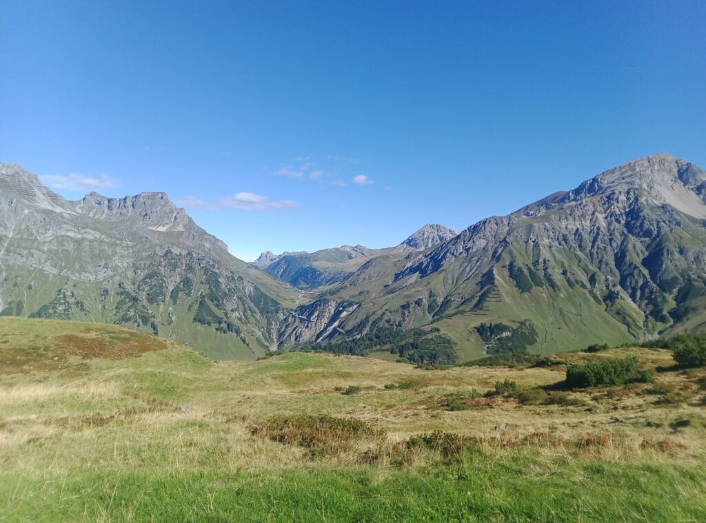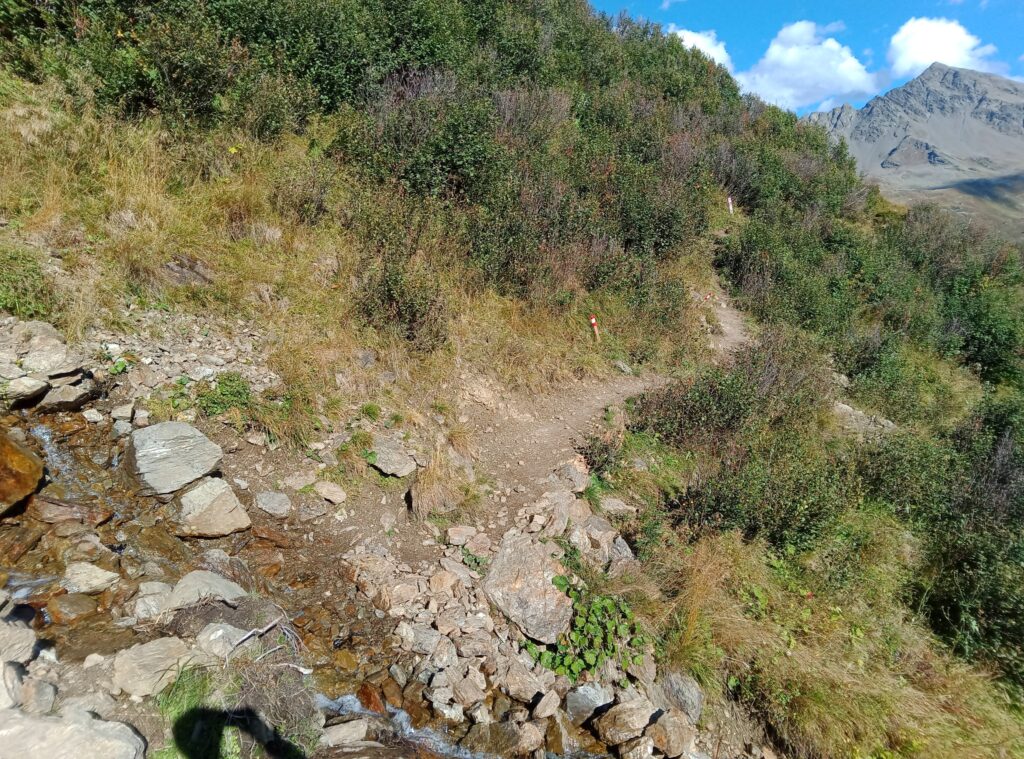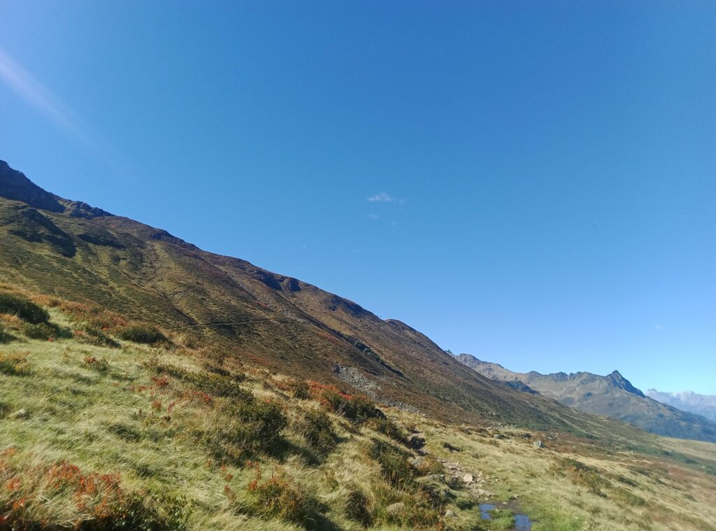 Nun steht nur noch der lange Abstieg ins Verwalltal zur Konstanzer Hütte an. Dieser beginnt erst steil, wird aber bald etwas flacher als der Weg in grasiges Gelände übergeht. Es geht lange über Wiesen, einem Rücken entlang einem tiefen Graben folgend. Schließlich folgt eine Querung durch einen teilweise mit Buschwerk besetzten, steilen Hang.