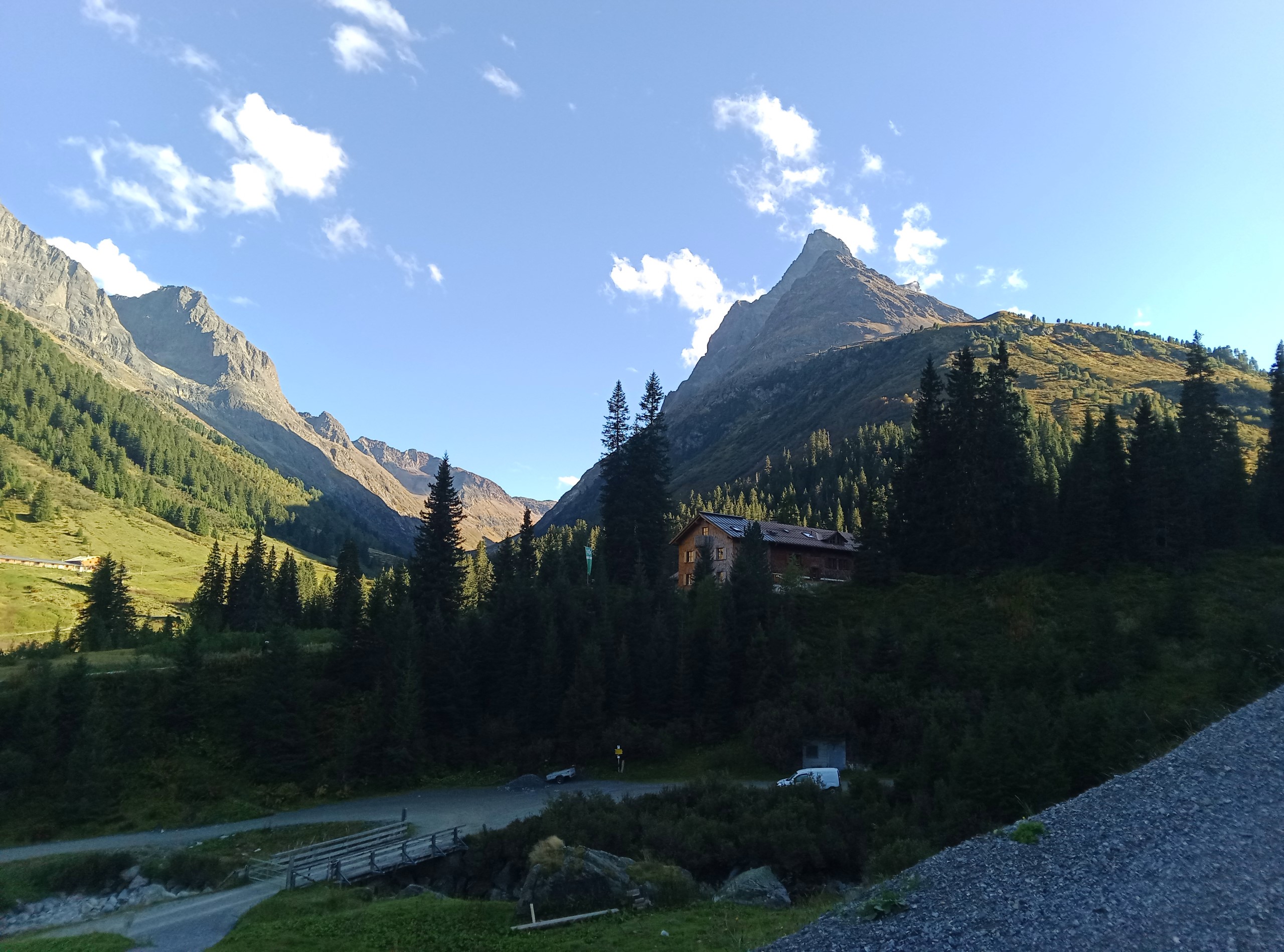 Es ist dann aber auch nicht mehr weit, einige weitere steile Kehren führen hinab auf einen Forstweg. Dieser leitet talauswärts, immer noch recht steil, vorbei an einer privaten Hütte, bis zur Brücke über die Rosanna direkt unterhalb der Konstanzer Hütte.