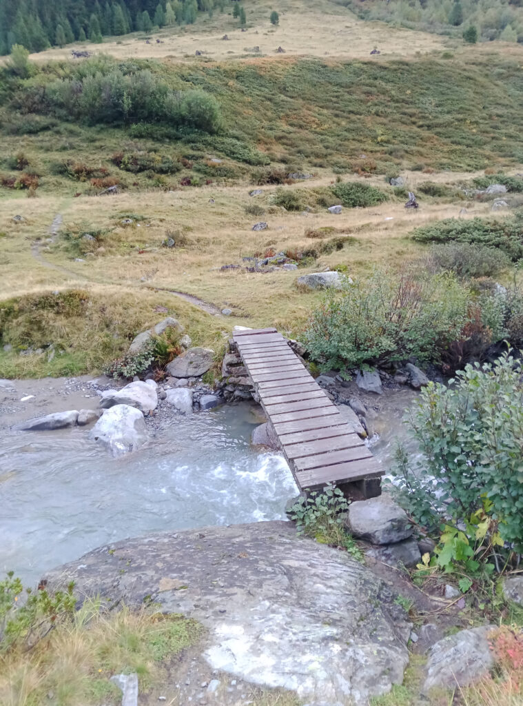 Bei einer Brücke wird nach links abgebogen, der Fasulbach gequert und der ehemalige Standort der Konstanzer Hütte passiert bevor es steil bergauf geht.