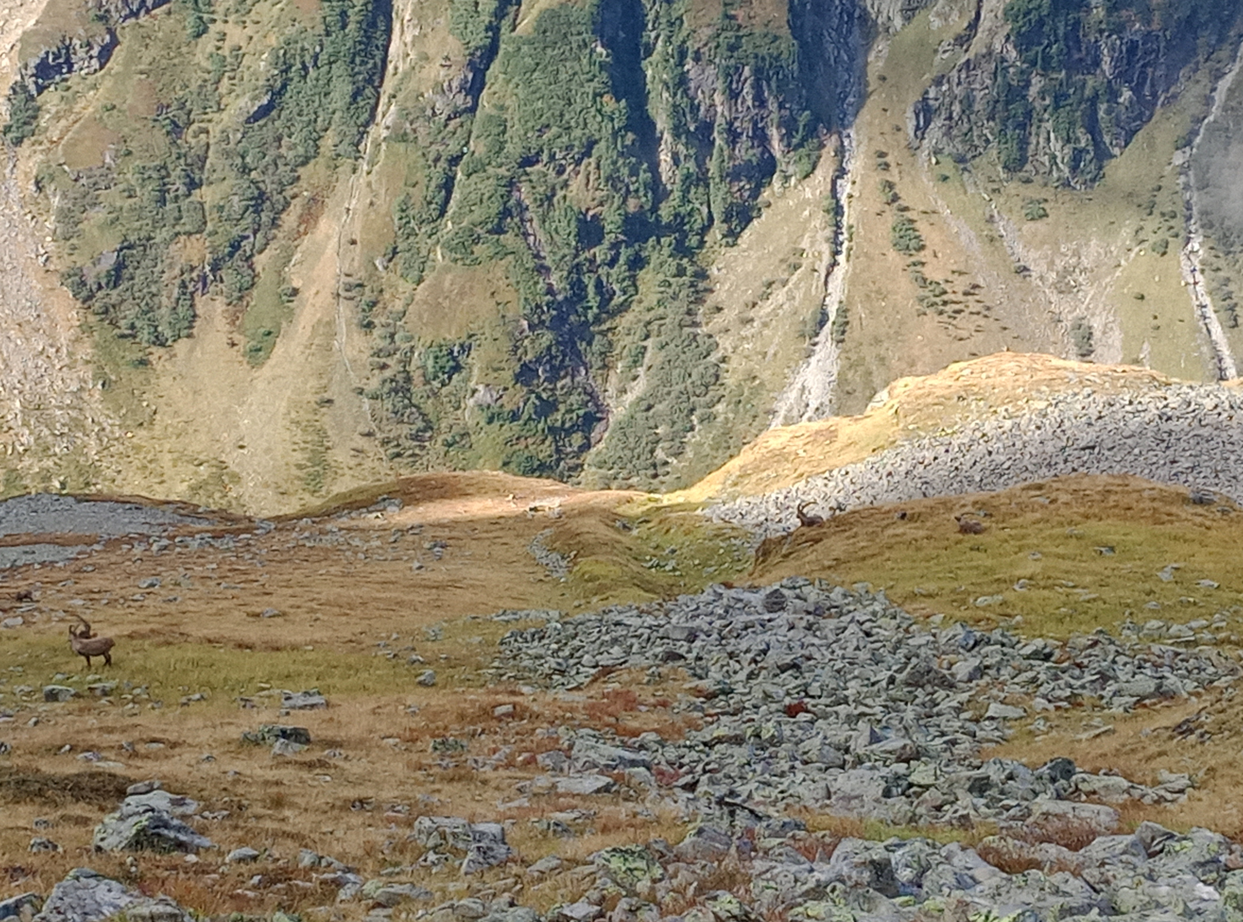 Bevor es dann ins felsige Gelände geht überholen mich ein paar junge Leute, die nach mir von der Hütte aufgebrochen sind, wir unterhalten uns kurz und entdecken wenig später zusammen mit einer kleinen Gruppe, die bereits von der Darmstädter Hütte kommend im Abstieg ist eine Gruppe von vier Steinböcken etwas unter uns.