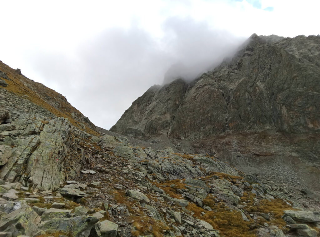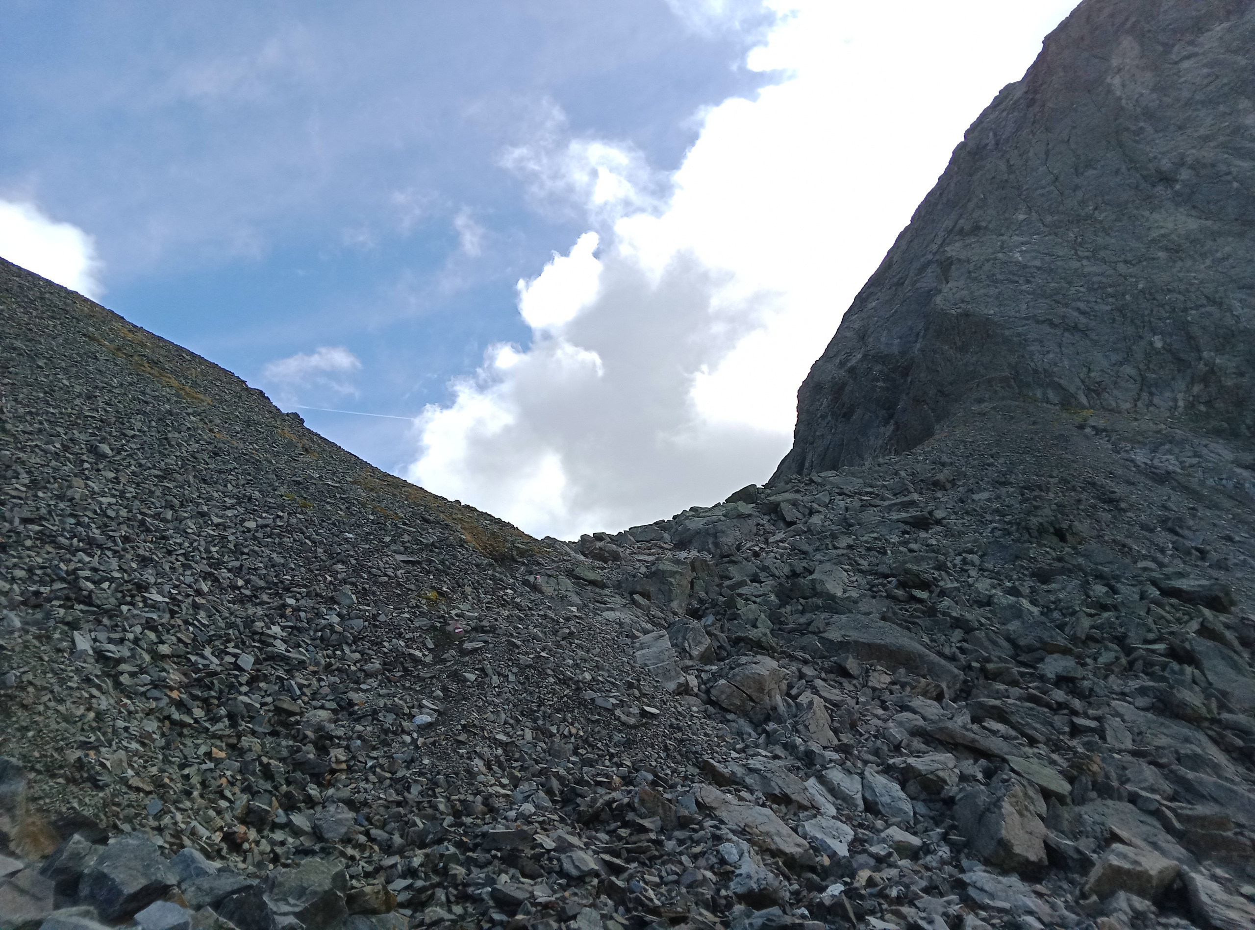 Der Anstieg geht nun langsam in Geröll und Blockwerk über als der Steig unter den brüchigen Wänden der Kuchenspitze weiter an Höhe gewinnt. Der Wind nimmt nun auch schnell zu und es fühlt sich unangenehm kalt an, Zeit die Handschuhe aus dem Rucksack zu holen.
