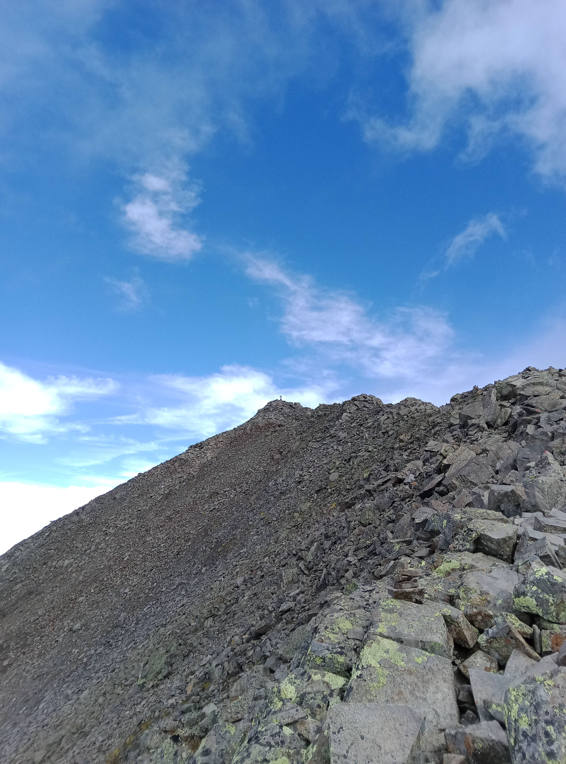 Schließlich wird eine Art Vorgipfel erreicht, von dem nun auch der restliche Wegverlauf zum eigentlichen Gipfel einsehbar ist. Dieser führt nochmal kurz etwas ausgesetzt am Grat entlang und schließlich durch einfaches Blockgelände zum Gipfel mit Kreuz auf 2978m.