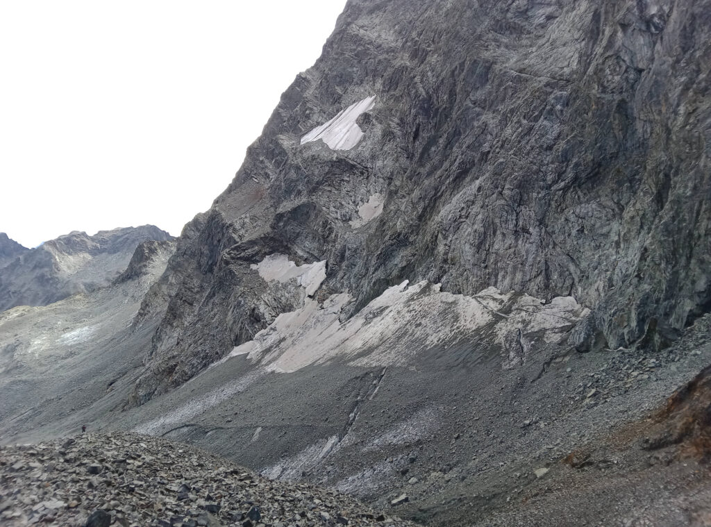 Mit einem kurzen Gegenanstieg wird schließlich ein grasiger Rücken direkt über der Darmstädter Hütte erreicht, und über diesen in wenigen Minuten bis zur Hütte abgestiegen.