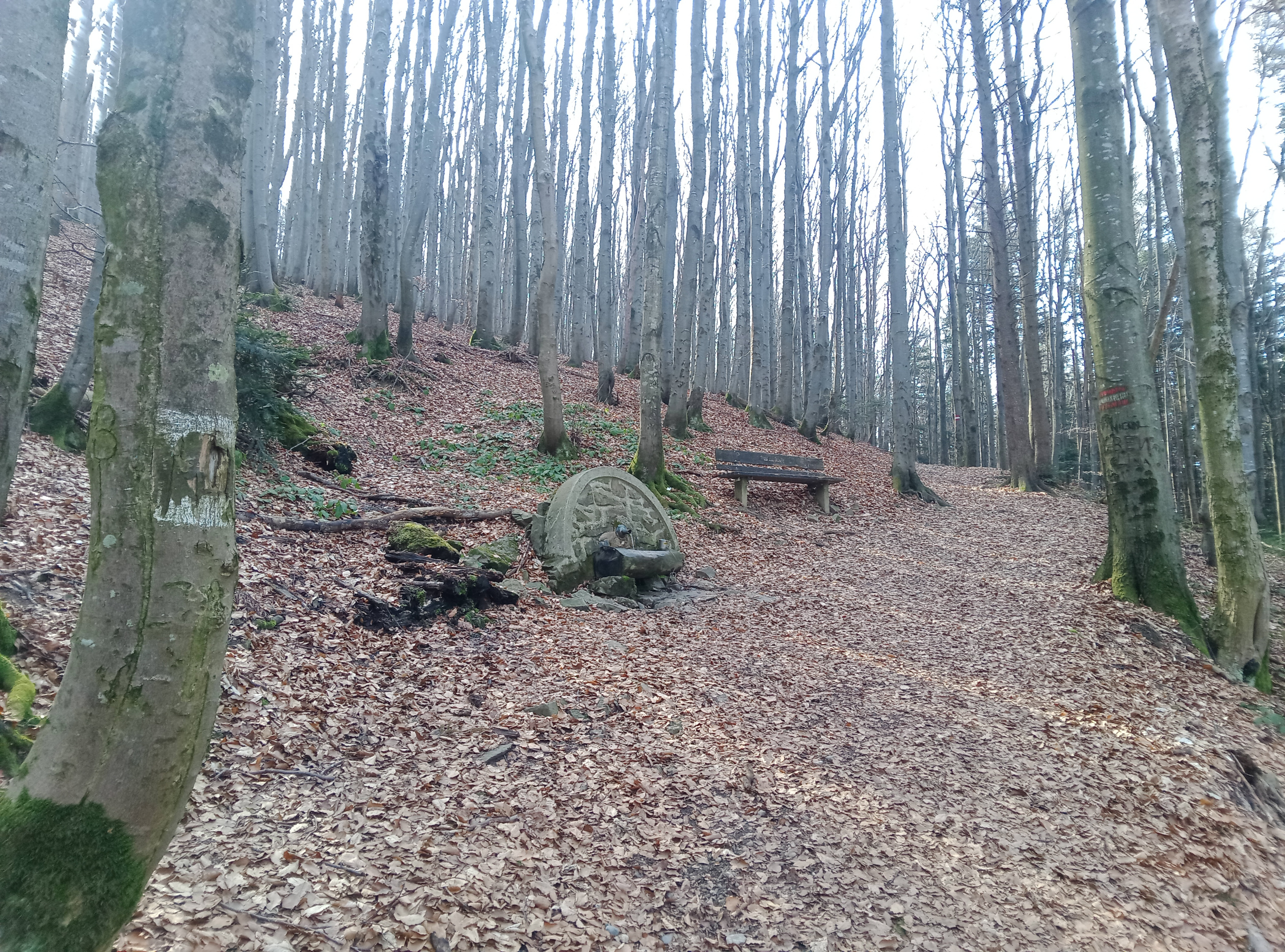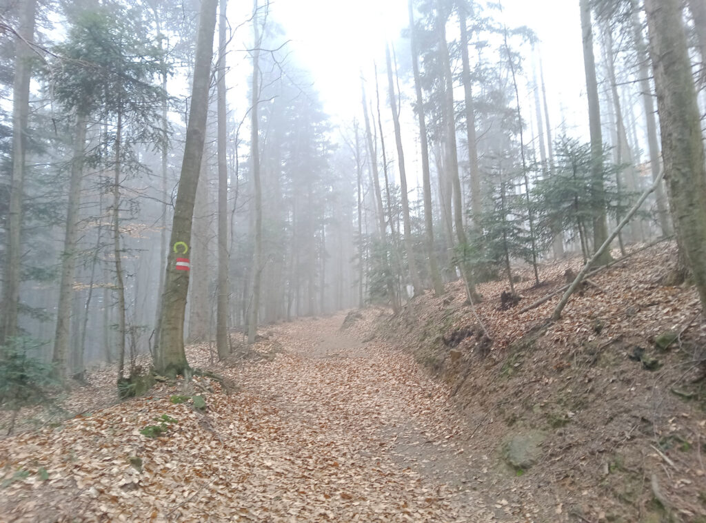 Der Weg durch den Wald ist angenehm, aber nicht wirklich spannend. Irgendwann geht es mal über eine Autobahn, dann immer noch aufsteigend am Kaiserbrunnberg vorbei, wo etwas vom Weg entfernt die Dürre Wien entspringt. Anschließend wird der namenlose Gipfel P.611m überschritten und der Jochgrabenberg etwas unterhalb passiert. Hier oben ist es am morgen noch ziemlich neblig und kalt.