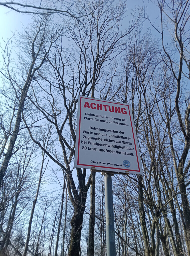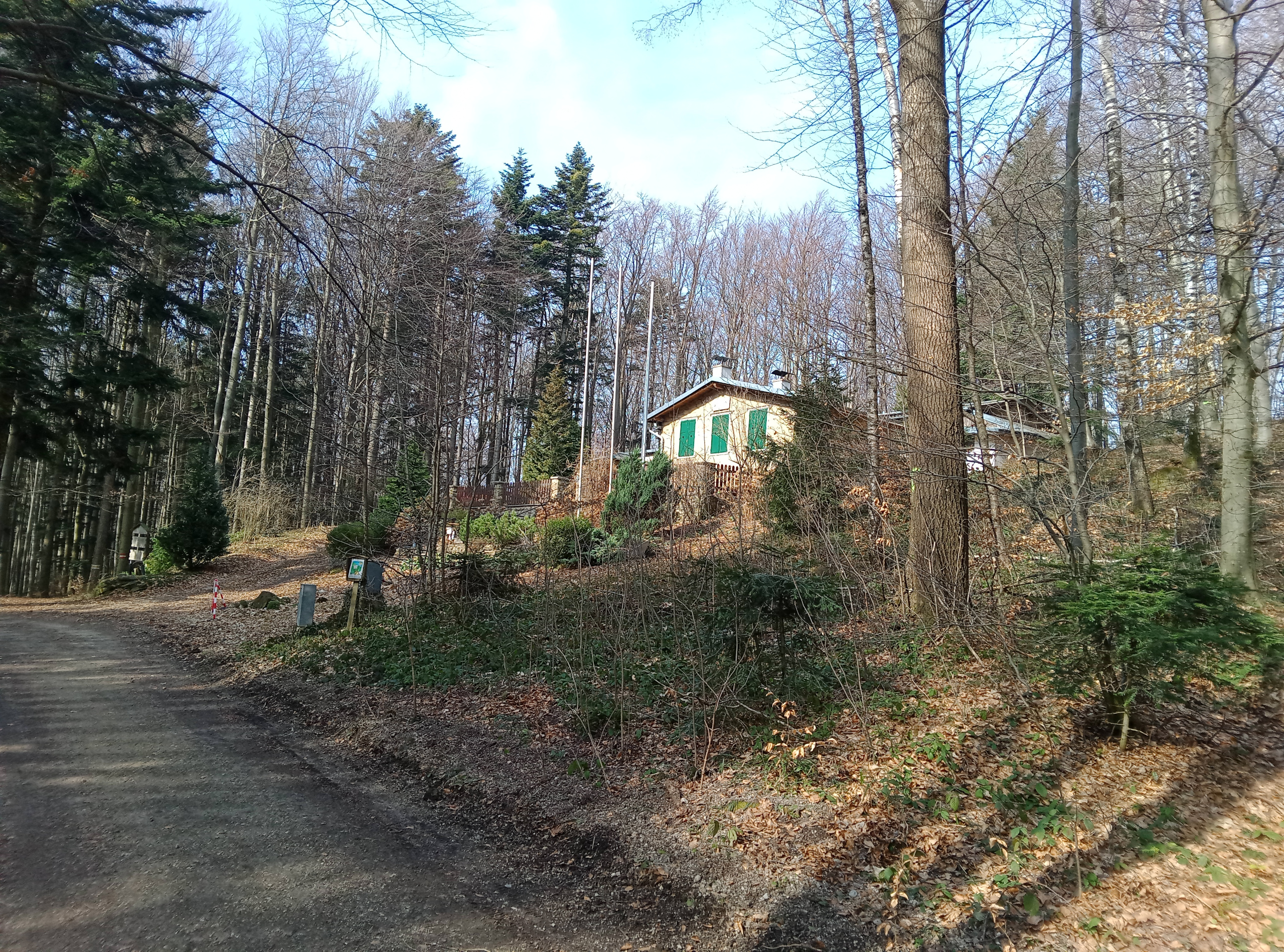 Der Gipfel wird nicht direkt erreicht, sondern etwas unterhalb südseitig umrundet. Hier stehen einige zum Teil sehr verlassene Häuser, und nach diesen die um diese Jahreszeit noch geschlossene Falkensteiner Hütte auf 610m, auch wenn das Schild an der Hütte etwas anderes behauptet.