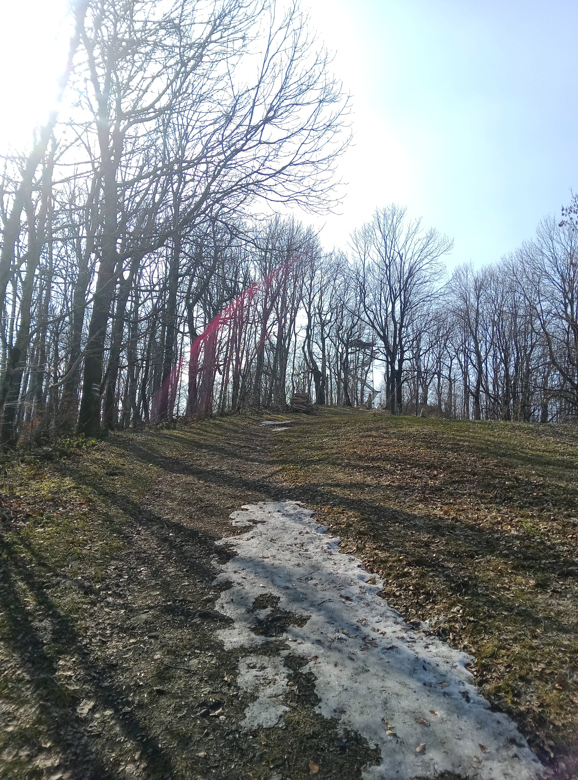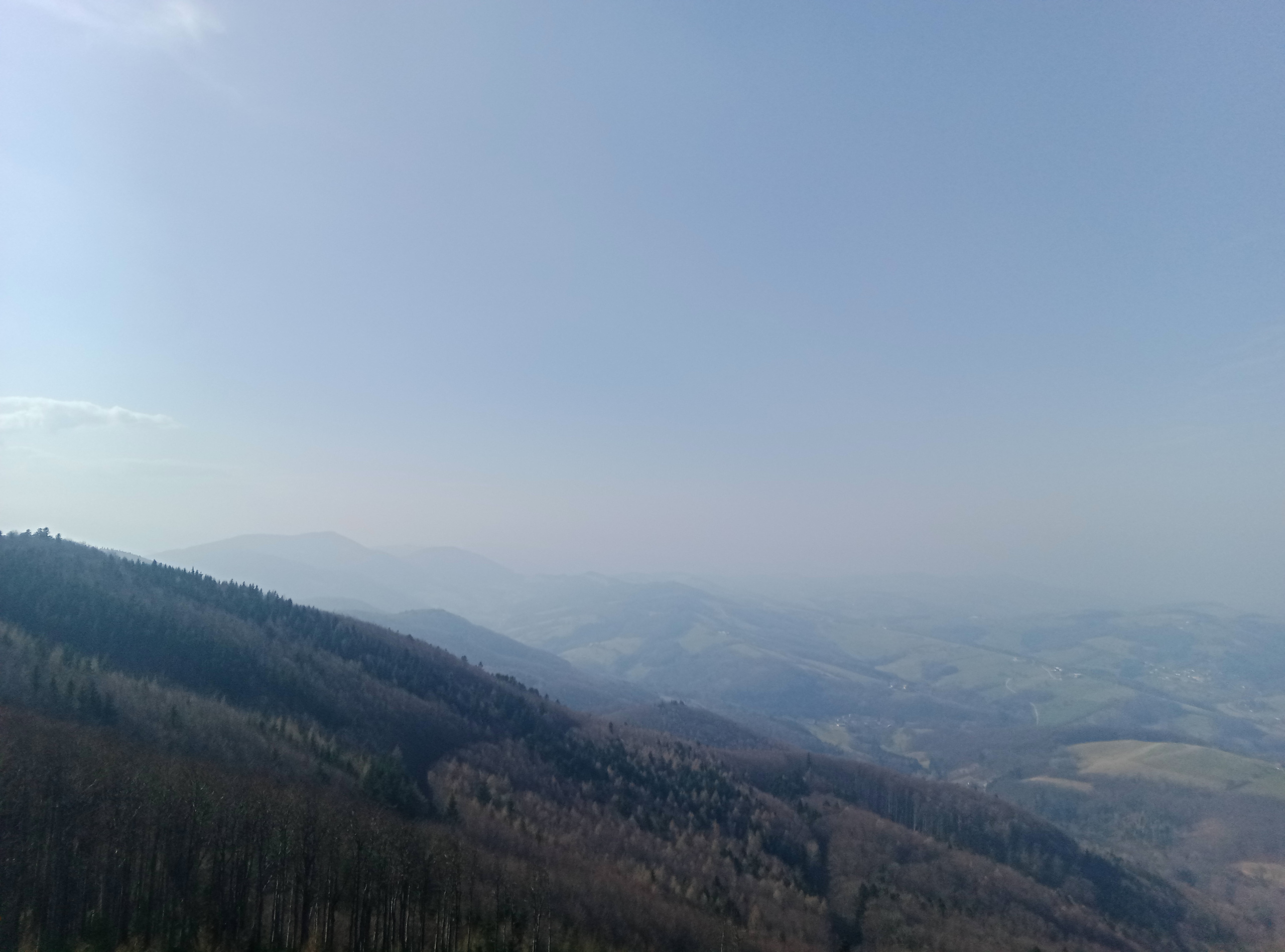 Von da ist es nur noch ein kurzer Grashang, auf dem sogar noch ein paar letzte Schneereste liegen, zum höchsten Gipfel des Wienerwalds, dem 893m hohen Schöpfl. Der Ausblick von der Matras-Warte auf dem Gipfel ist erstaunlich, auch wenn die Sicht etwas eingeschränkt ist.