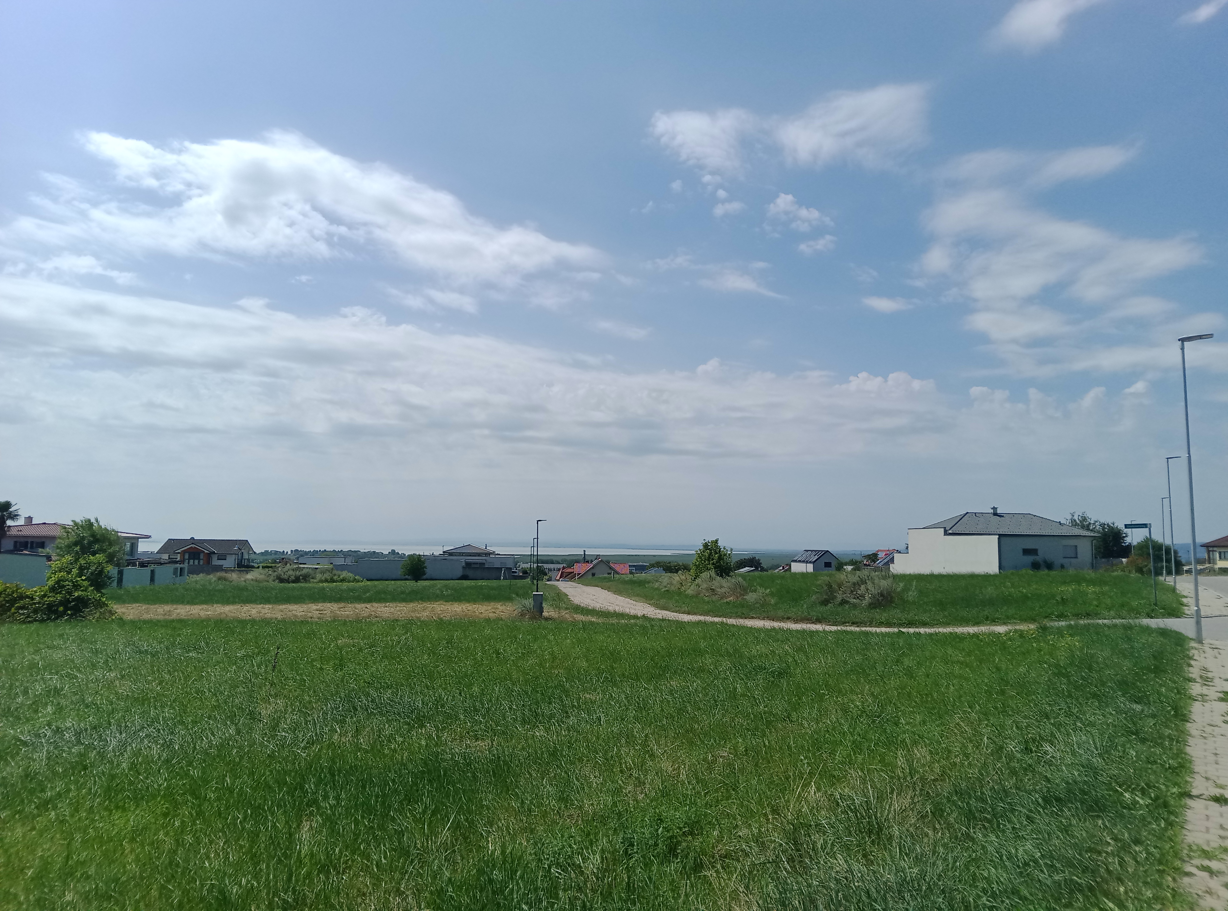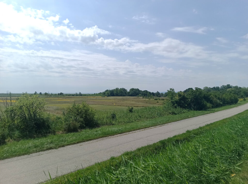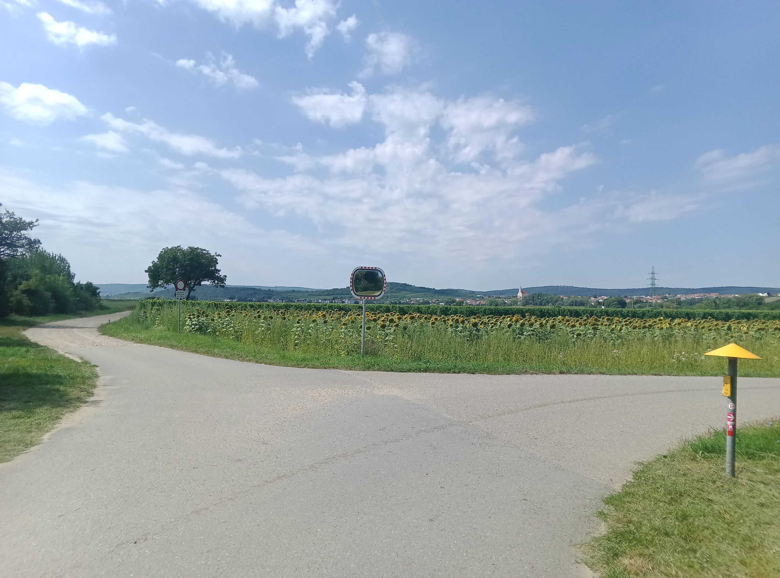 Danach wird es kurz etwas rätselhaft, die Lösung ist erst wenn es nicht mehr weitergeht links abzubiegen. Auf dem nun folgenden Teil nimmt die Anzahl an Flächen Weinbergen, also praktisch Weinebenen, deutlich zu. Oberhalb von Neusiedl treffe ich auf eine Asphaltstraße, der ich nach rechts, und bei nächster Gelegenheit nach links folge. Mit ersten Blicken auf den Neusiedler See in der Ferne steige ich in Richtung Neusiedl ab. Denn selbst auf 180m kann man in Österreich noch absteigen. Die Gegend um den See liegt nämlich nur noch auf 124m. Der tiefste Punkt Österreichs liegt übrigens noch etwas weiter östlich, auf 114m.