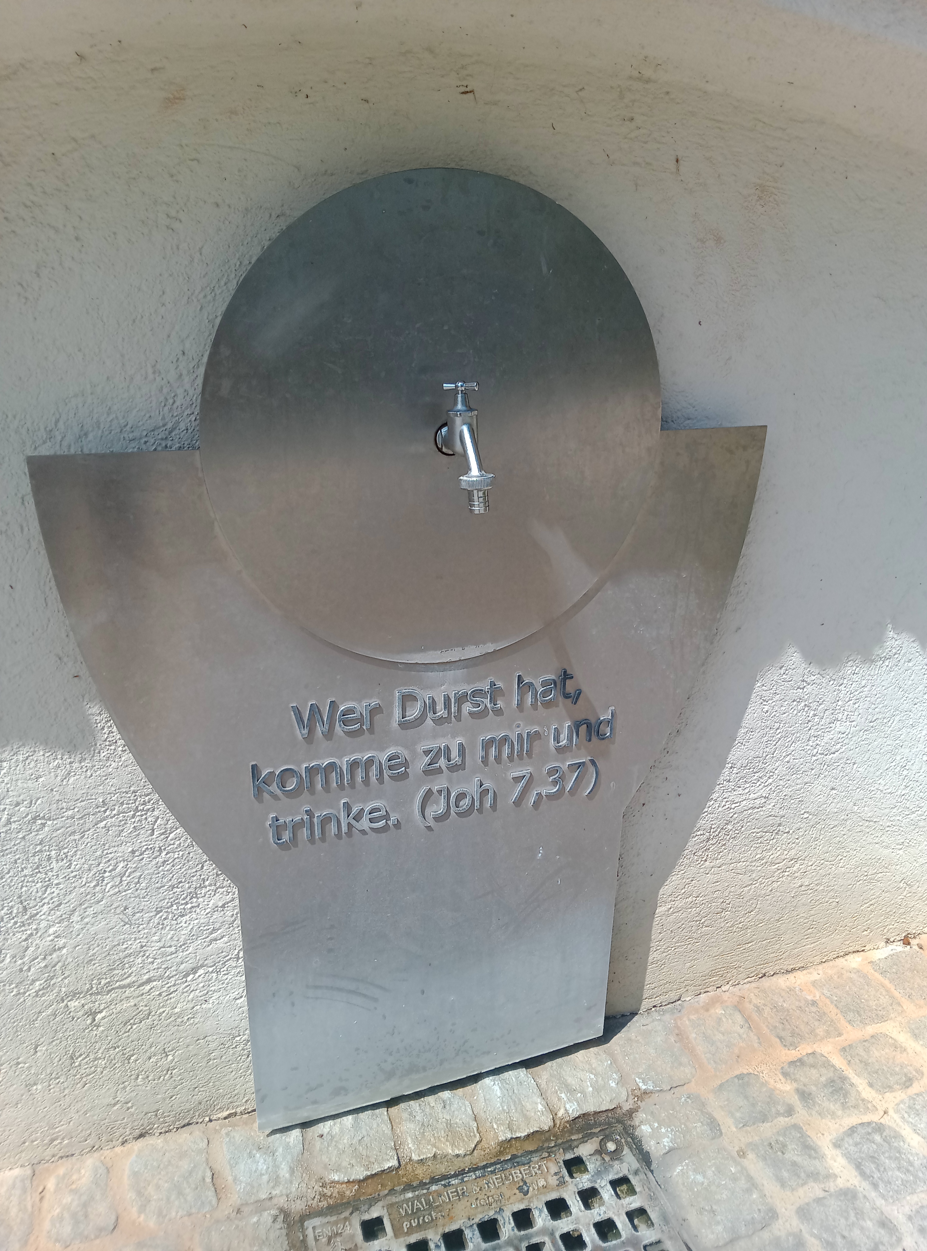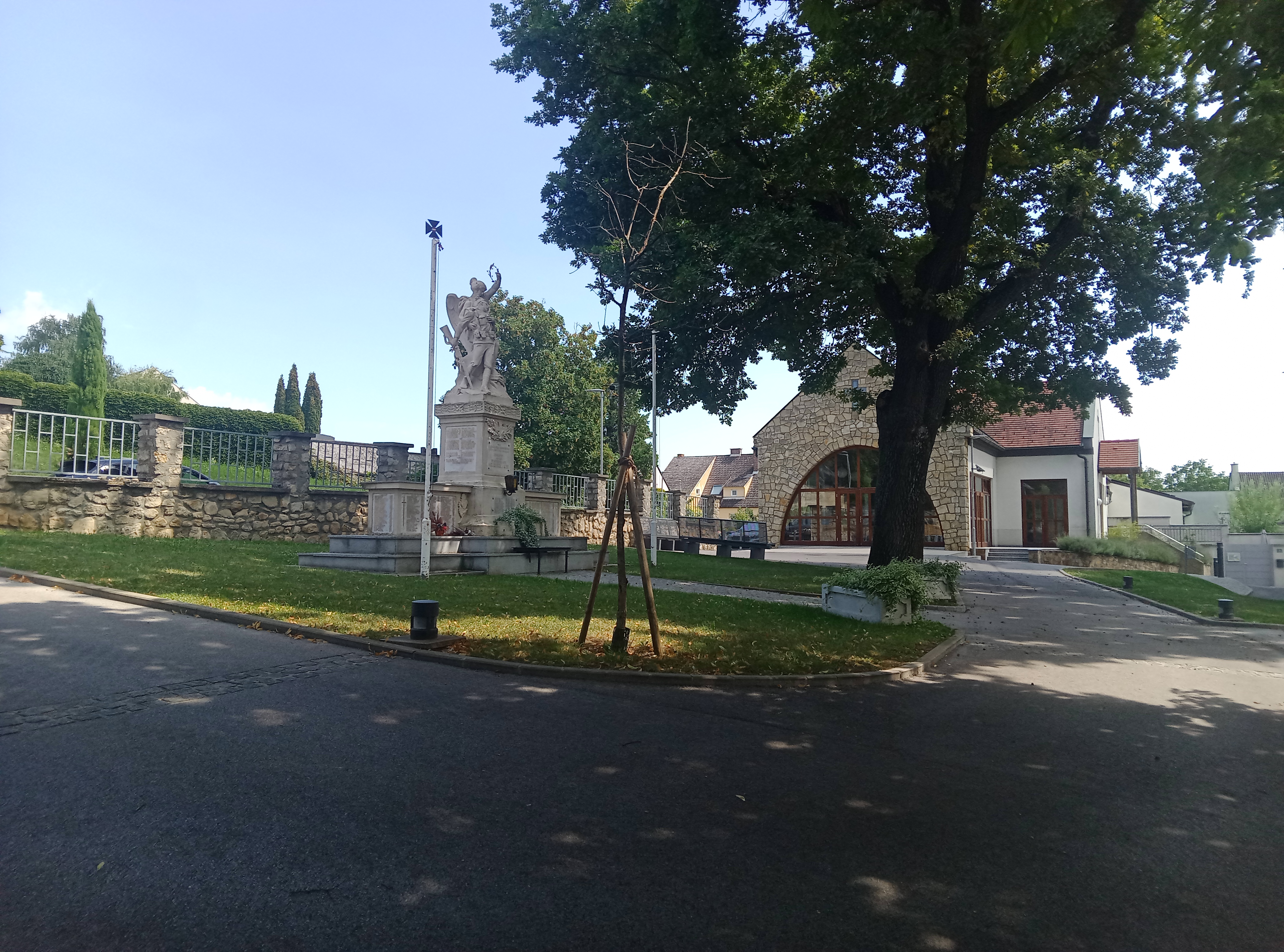 In Neusiedl gehe ich erst mal geradeaus und biege dann rechts, auf die Kirche zu, ab. Da gibt es Pausenplätze im Schatten, und vor allem Trinkwasser.