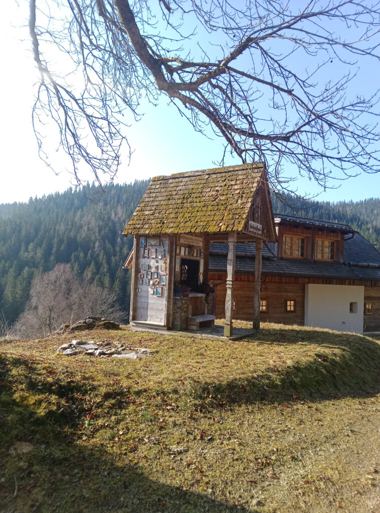 An einem Bauernhof vorbei geht es aufwärts, auf zunehmend schmaler werdenden Steigen, bis im Bereich des Graneggs wieder eine breite Forststraße erreicht wird. Relativ flach, aber teilweise sehr schlecht markiert führt der Weg über die Höhenlagen, dank falschem Abbiegen auch vorbei an einem großen Jagdhaus. Nach diesem ist der Weg durch Forstarbeiten ziemlich matschig, und bald mit zunehmender Höhe auch stark vereist. Grödel wären hier mal wieder das Mittel der Wahl, zum Glück geht’s aber auch ohne.