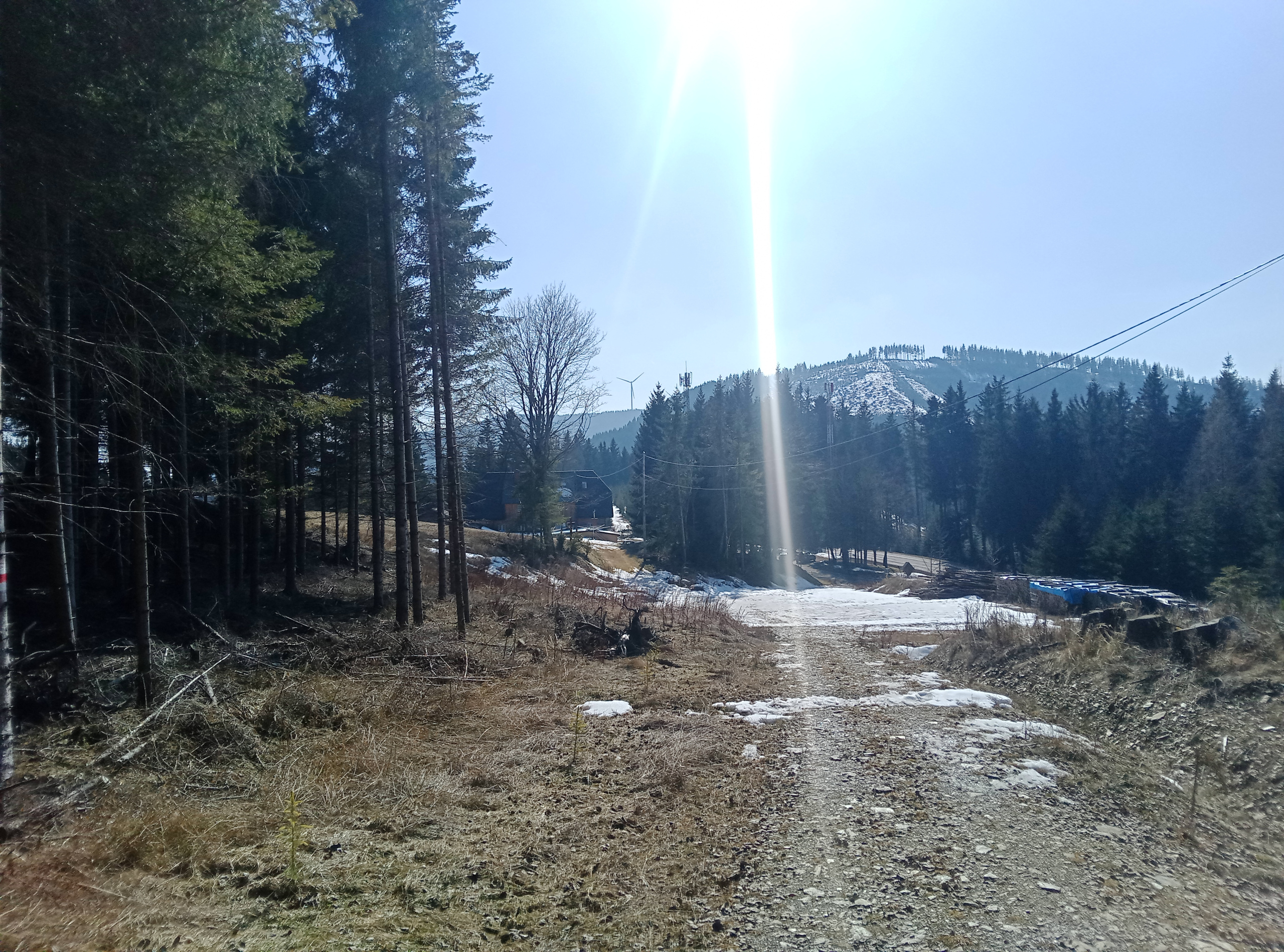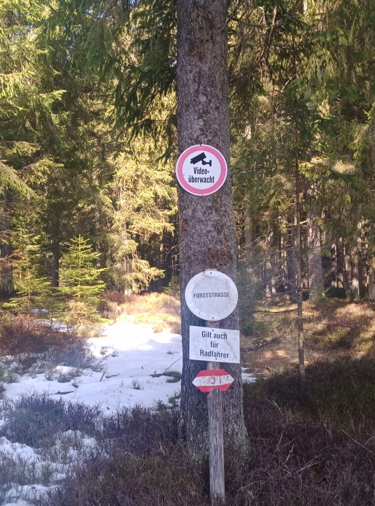Vorbei am (geöffneten!) Gasthof Auf der Schanz, wo mir zum ersten Mal seit dem Waldarbeiter bei Alpl andere Menschen begegnen, überquere ich die Passstraße. Eine ziemlich ebene Sandstraße führt nun ein ganzes Stück nach Süden, bevor sie langsam wieder anzusteigen beginnt. Kurz vor dem „Bergbauern“, hier kann man wohl auch übernachten, zweigt dann ein deutlich steilerer Steig ab, und wenig später kommt dann auch wieder Schnee dazu, der macht hier aber keine Probleme.
