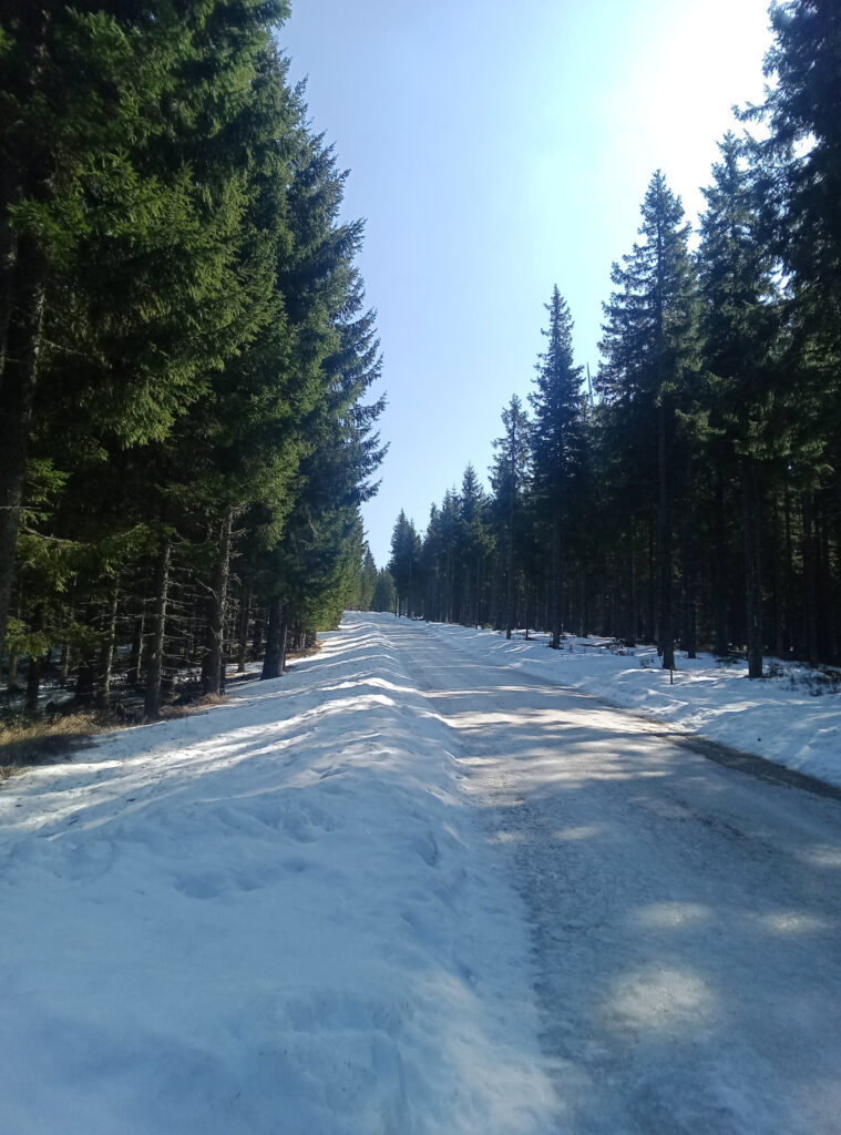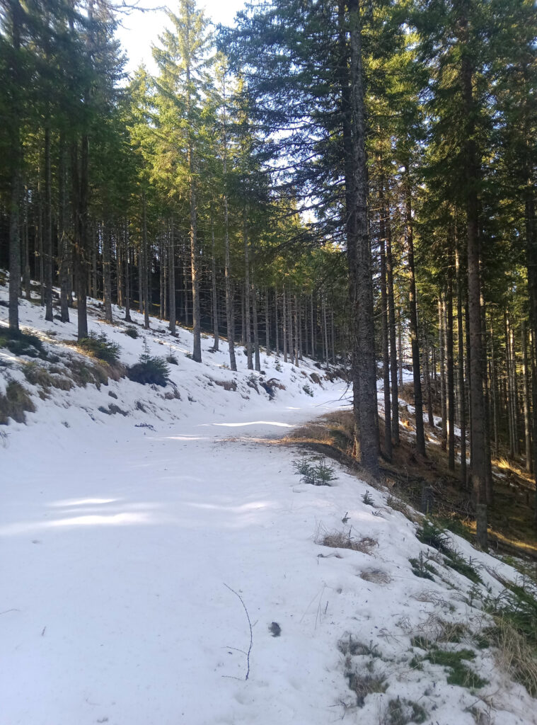 Aufpassen ist auch hier angesagt, nicht wegen Ausgestztheit oder ähnlichem, sondern weil der Stieg sobald er von der breiten Forststraße abzweigt oftmals zu einer eisgefüllten Rinne wird, in welcher es Zweige, Steine und ähnliches als Anti-Rutsch-Belag zu nutzen gilt um keinen Abflug zu machen. Zumindest kommt man trotzdem recht flott voran und schließlich trete ich nur wenige Meter von der Straße über den Schanzsattel entfernt aus dem Wald.