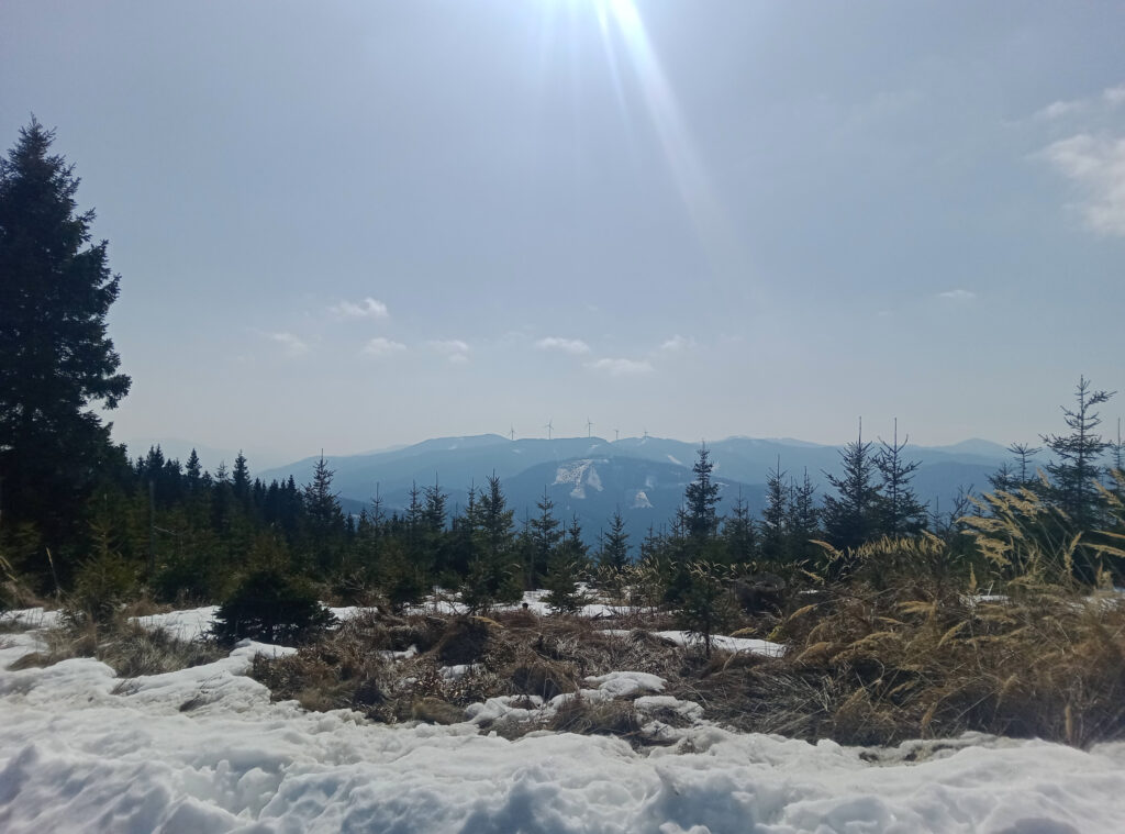 Ein breiter, bewaldeter Rücken leitet nun nach Süden auf den Fürstkogel mit dem nächsten Windpark zu. Kurz durch mühsamen, ungespurten Tiefschnee erreiche ich die Zufahrtsstraße zum Windpark. Auf dieser wird der eigentliche Gipfel deutlich weniger mühsam in einem Bogen nach Osten umrundet.