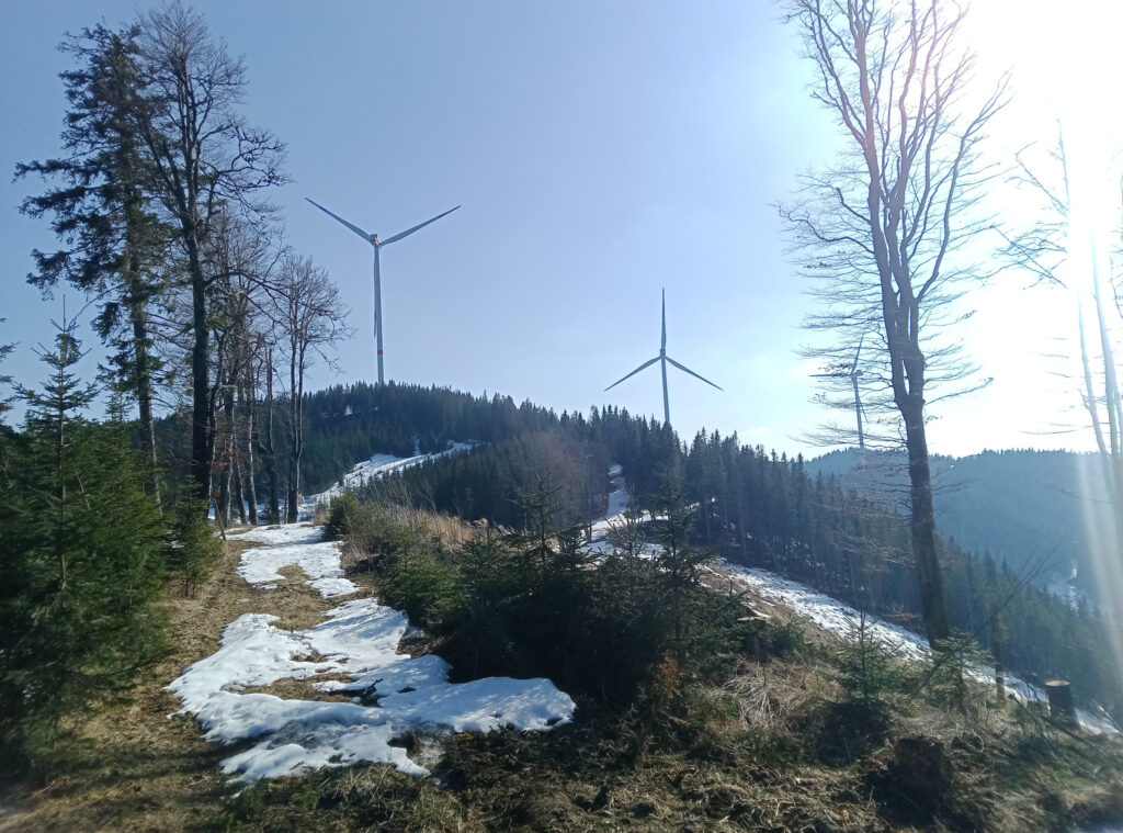 An der bald erreichten Abzweigung zur Stanglalm geht es dann aber schon wieder zurück auf die festgefahrene Eisbahn und über diese kurz steil hinauf zu den Windkraftanlagen im Gipfelbereich des Hochpürschtlings. An einem eingeschneiten Picknickplatz mit gefrorener Quelle vorbei wird der Windpark passiert und der Abstieg zum Schanzsattel beginnt.