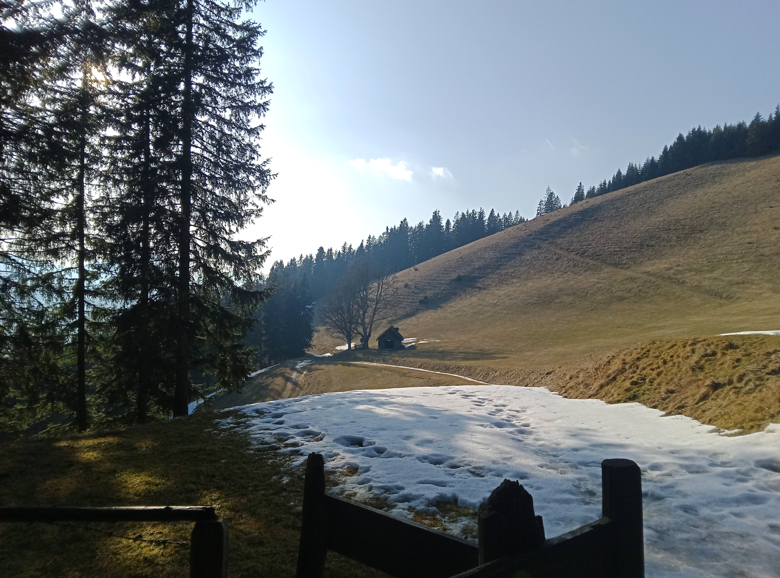 So führt mein Weg relativ eben zum nicht mehr weit entfernten Knappensattel auf 1298m. Von diesem kurz steil ansteigend führt der weitere Weg nun an der Südflanke des Gebirgszuges zwischen Knappensattel und Straßegg entlang, was einen fast völlig schneefreien Restweg bedeutet. Stellenweise kommt in den sonigen, warmen Grashängen zwischen den Waldstücken echte Sommerstimmung auf.