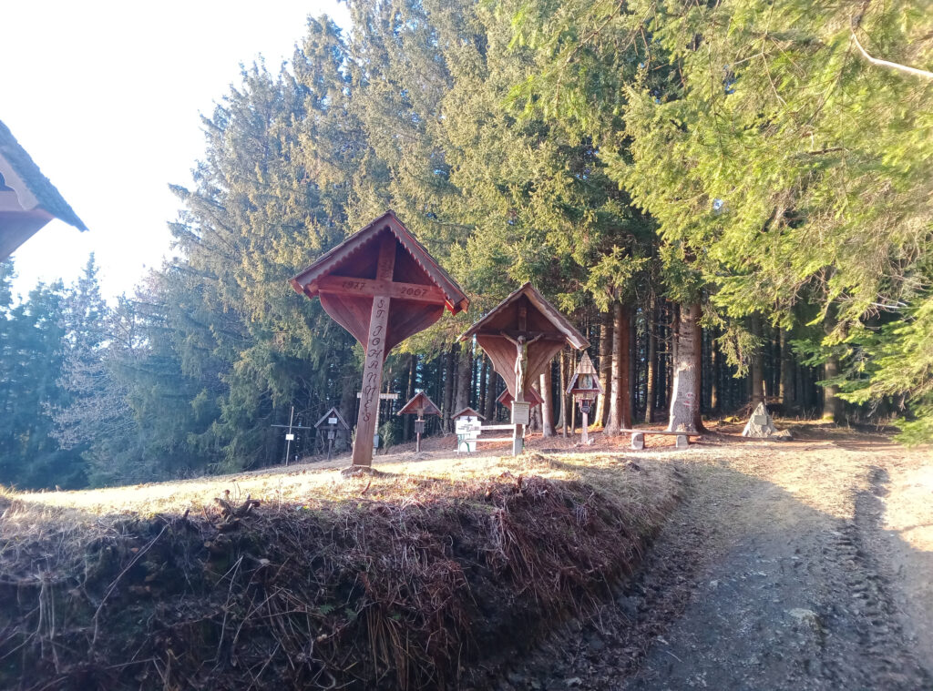 Von hier ist es eigentlich nur noch eine schöne, aussichtsreiche Höhenwanderung mit wenigen Steigungen unter den Gipfeln von Aibelhöhe, Feichtkogel, Beißenkogel und Reschenkogel vorbei. Da der Weg hier wieder mit dem Mariazeller-Weg verläuft ist dieser Abschnitt gesäumt von vielen Wallfahrerkreuzen. Kurz vor dem Straßegg komme ich an einer ganzen Horde davon vorbei.