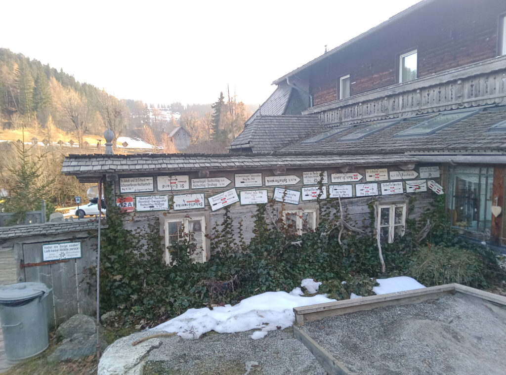 Von dort sind es dann nur noch wenige Meter zum mit unzähligen Wander-Wegweisern verzierten Gasthaus Stroßeggwirt. Pünktlich um 17 Uhr treffe ich dort ein, früh genug, dass noch Zeit für ein Schnitzel und ein Radler ist bevor dicht gemacht wird und ich mein gemütliches Zimmer beziehen kann.