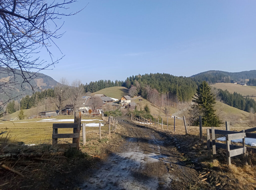 Der Abstieg erfolgt zunächst nach Westen, und anschließend steil über Wiesen an einem Zaun entlang nach Süden. Zuletzt einige steile Meter weglos (habe irgendwo eine Abzweigung verpasst…) erreiche ich die im Talboden liegende Sandstraße, welcher der 02er eigentlich folgt, somit bin ich wieder zurück auf dem rechten Weg. Nach wenigen Minuten erreiche ich die nicht wirklich hübsche Teichalm, wo der Tourismus doch arge Spuren in Form von übertriebenen Luxus-Hotels hinterließ.