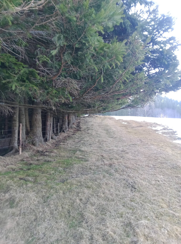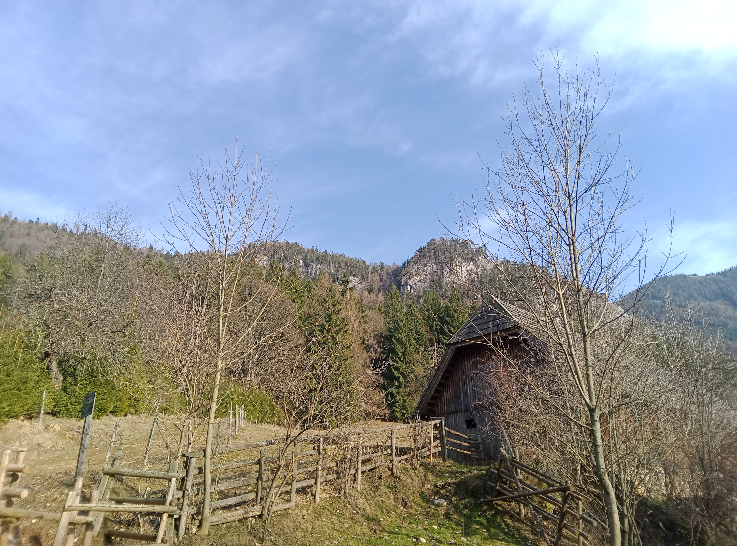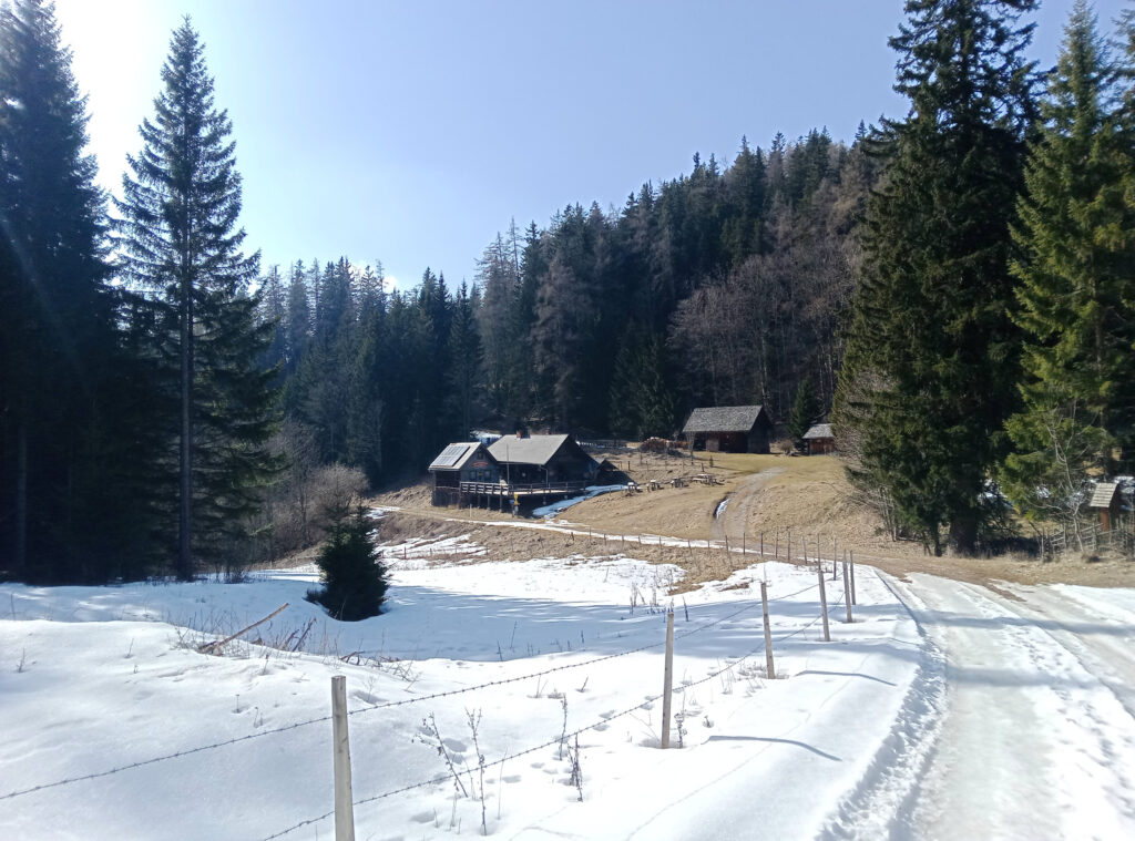 Kurz unter dem Gasthaus überquere ich die Straße und beginne auf der anderen Seite den steilen Aufstieg in den Wald hinein. Der ist in dieser Höhe noch angenehm schneefrei, wenn auch von schwerem Forstgerät arg zerfahren. Das wird erst besser, als es nach einem Wegkreuz etwas flacher wird, dafür kommt nach einem kurzen Stück auf einem Feldweg nun wieder Schnee dazu. Dieser wird nach kurzer Zeit wieder nach rechts verlassen und nochmal etwas ansteigend wird der Haberlstall erreicht, wo im Sommer scheinbar auch eine Einkehrmöglichkeit besteht.