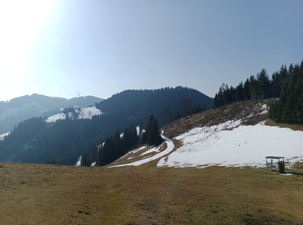 Über Wiesen und Schnee erreiche ich die erste Erhebung im Rücken, den Kulmkogel (1410m). Von dort kurz abwärts, dann wieder leicht hinauf zum unscheinbaren, nicht wirklich als Gipfel zu erkennenden Mooskogel, wo sich die Bergstation des Skilifts Holzmeister befindet. Der wirkt auch am Sonntag Mittag nicht gerade überlaufen… Nun kurz über hart gefrorenen Schnee zügig an der Nordseite hinab zur Stoahandhütte, anschließend wieder steil aufwärts auf den Nestbodnerkogel (1393m).