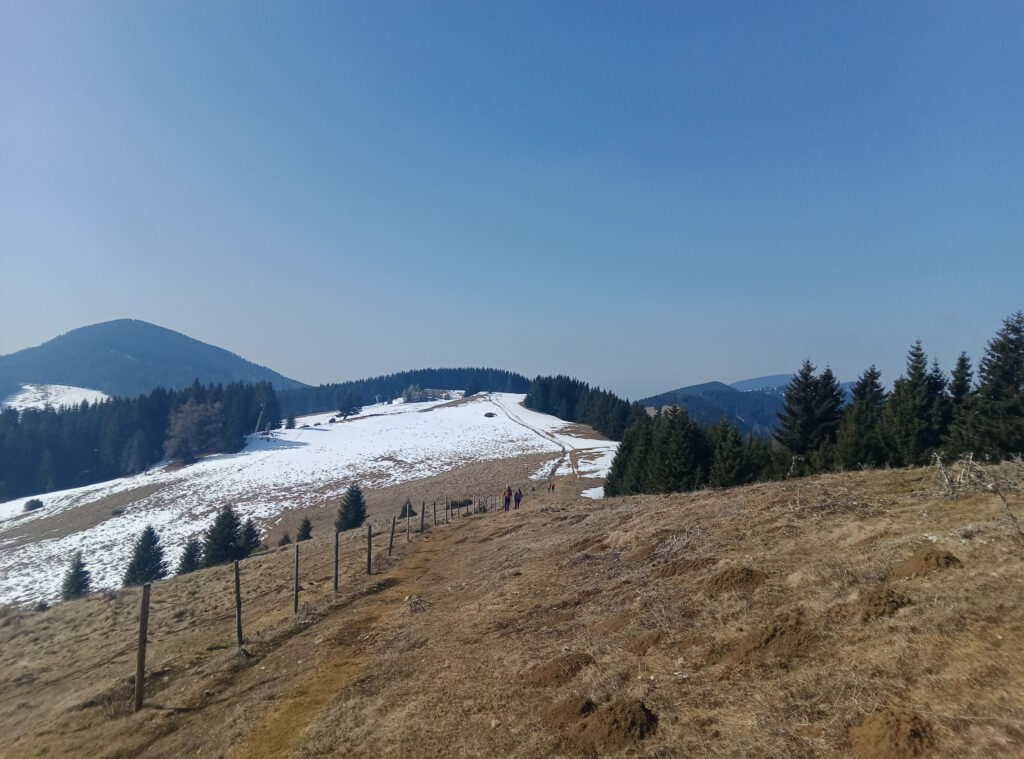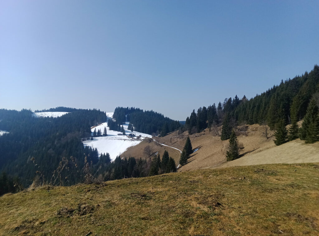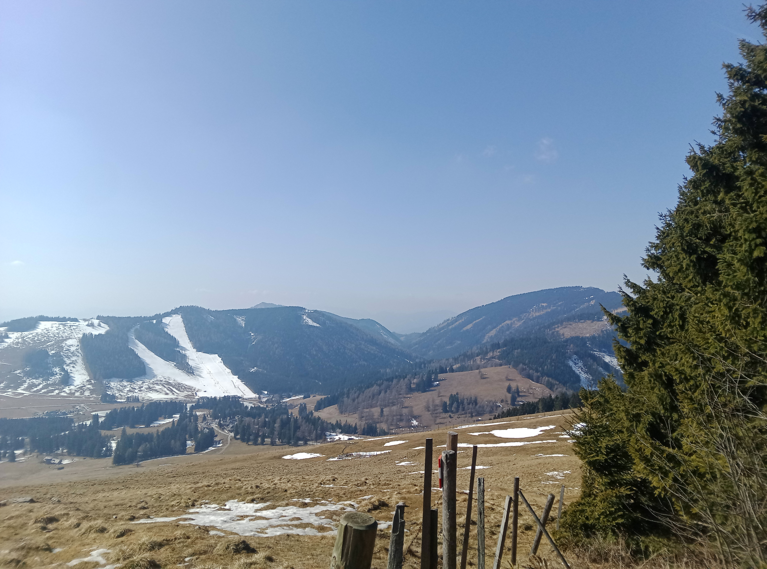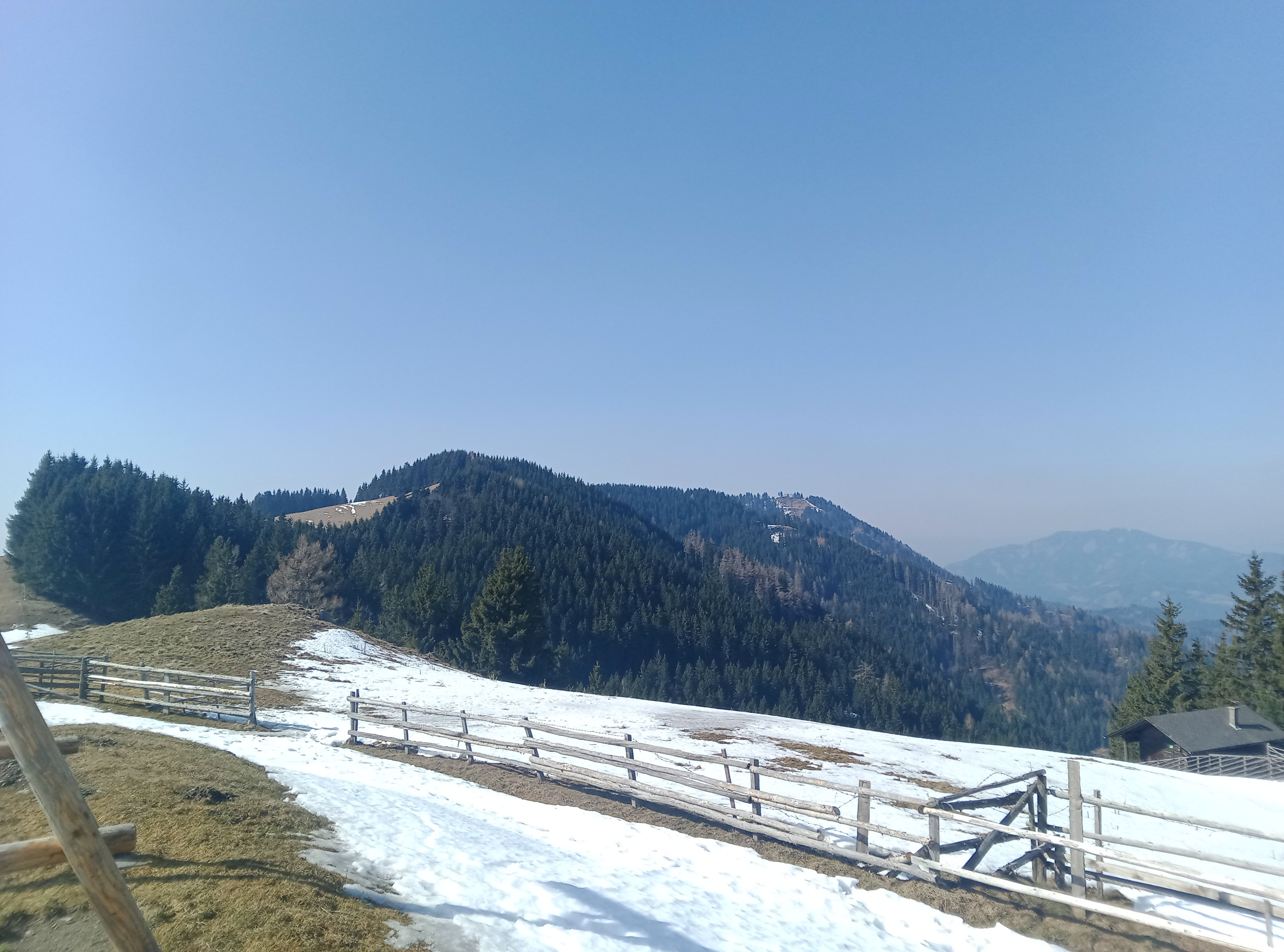 Dann ist die Wegsituation kurz nicht eindeutig, da es mehrere fast parallele Möglichkeiten gibt, ich nehme erst die linke, dann an einer Verzweigung die rechte. Über nun tiefer werdenden Schnee ansteigend erreiche ich so einen weiteren Wegweiser auf einer namenlosen Erhebung, von der sich erstmals der Blick ins Tal der Teichalm öffnet.