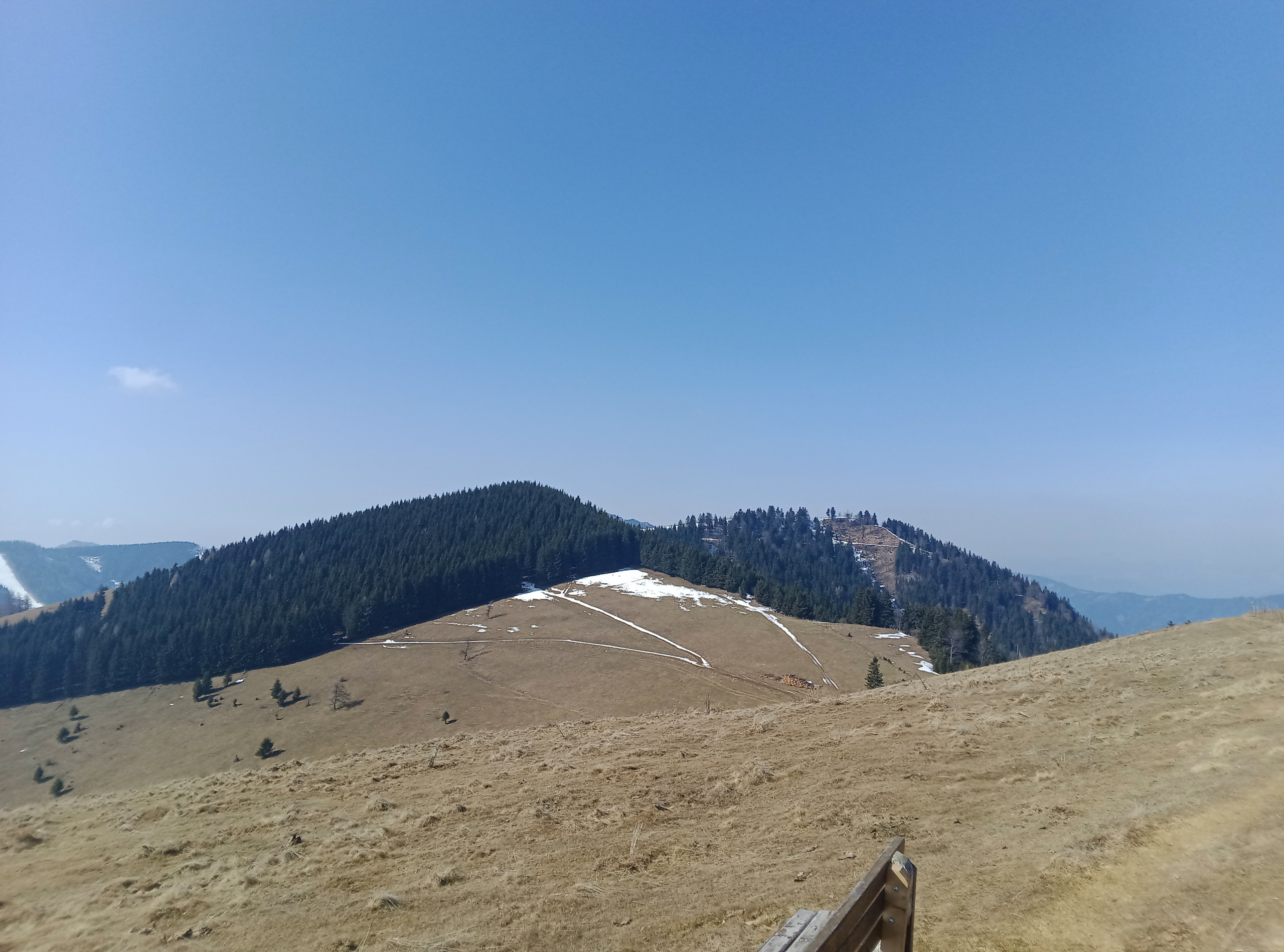 Es folgt ein weiterer Abstieg, und anschließend der sehr steile Anstieg zum Grubbauerkogel, der allerdings etwas südlich unter dem höchsten Punkt passiert wird. Nach einem letzten Zwischenabstieg beginnt der letzte, auch wieder sehr steile Anstieg zum Heulantsch. Über Wiesen wird der Wald erreicht, in welchem der Weg von Forstarbeiten etwas mitgenommen und nicht ganz einfach zu finden ist, aber immer steil aufwärts ist hier der richtige Weg. Wenig später erreiche ich schließlich den Gipfel des Heulantsch (1471m) mit Gipfelkreuz. Während der Wald den Blick nach Norden behindert, ist die Sicht nach Süden über die etwa 300m tiefer liegende Teichalm mit ihren Skiliften und -pisten ist dafür perfekt.