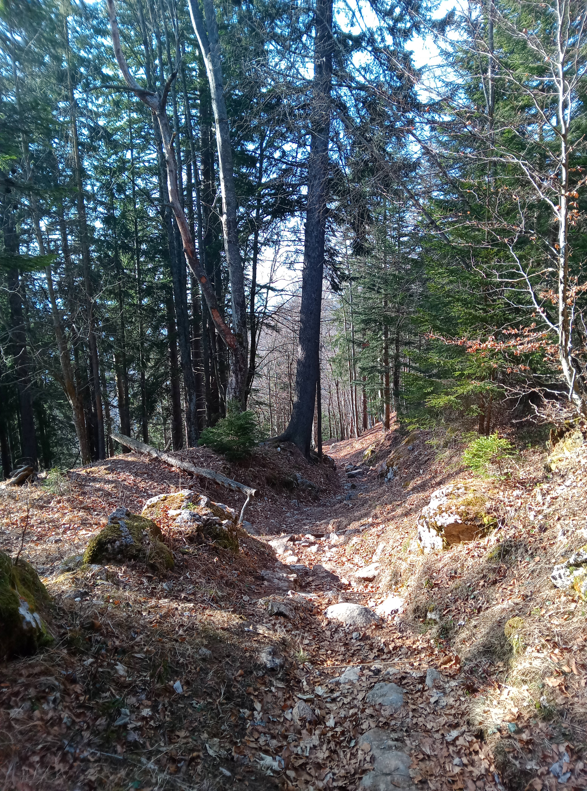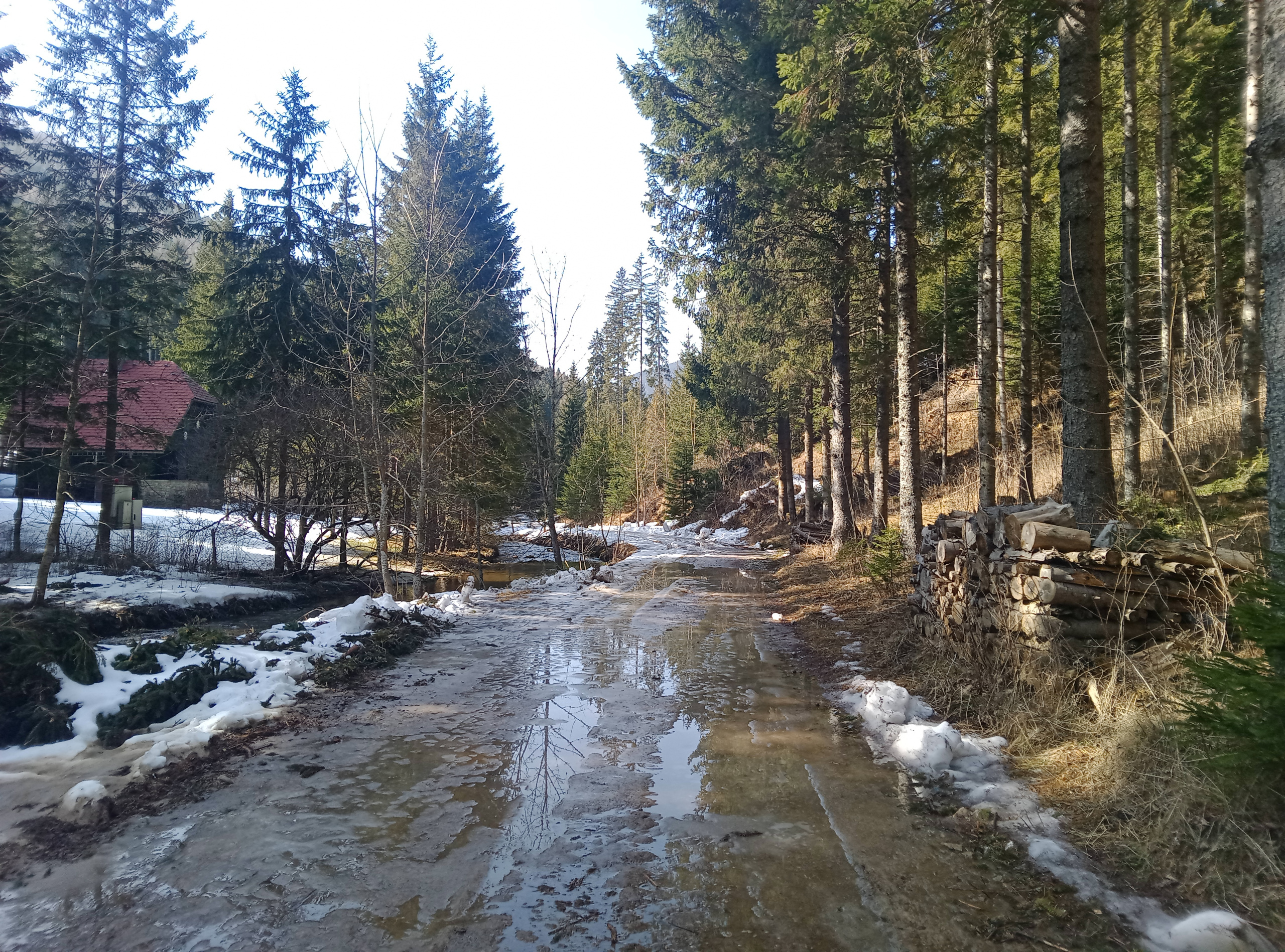 Hier treffe ich auch bald wieder auf meinen aktuellen Dauer-Feind: Einen komplett vereisten Fahrweg. Erschwerend kommt hier noch dazu, dass direkt links davon der Bach fließt, während die rechte Seite oft steil ansteigt und/oder stark zugewachsen ist. An vielen Stellen bleibt daher nicht viel anderes übrig, als die am wenigsten rutschigen Eisflächen zu suchen. Entsprechend zieht sich der ansonsten sicher sehr angenehme, flache Weg auch gewaltig. Und kurz bevor das Schlimmste dann endlich vorbei ist fliege ich dann auch noch einmal ordentlich hin…