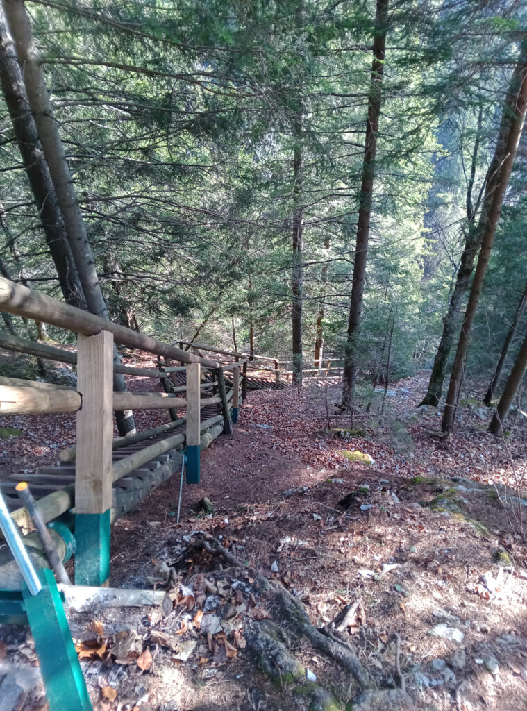 In die geht es auch direkt extrem steil hinein, über hölzerne Stege und Treppen, die fast schon steil genug sind, um Leitern zu sein. Spuren von Bauarbeiten sind hier zu sehen, teilweise fehlen auch kurze Stücke der Holzstege, aber nichts, was einen einigermaßen schwindelfreien Wanderer aufhalten würde. Etwa 50 Höhenmeter tief in der Klamm sieht das dann aber ganz anders aus. Oben stand zwar, dass darum gebeten wird, die Wintersperre zu respektieren, hier unten steht nun ein massives, verschlossenes Gittertor mitten auf einer Brücke im Weg. Klar, irgendwie könnte man auch da vorbeiklettern, aber es gibt Dinge, die man mit einem schweren Rucksack und ohne Seil nicht unbedingt tun möchte…
