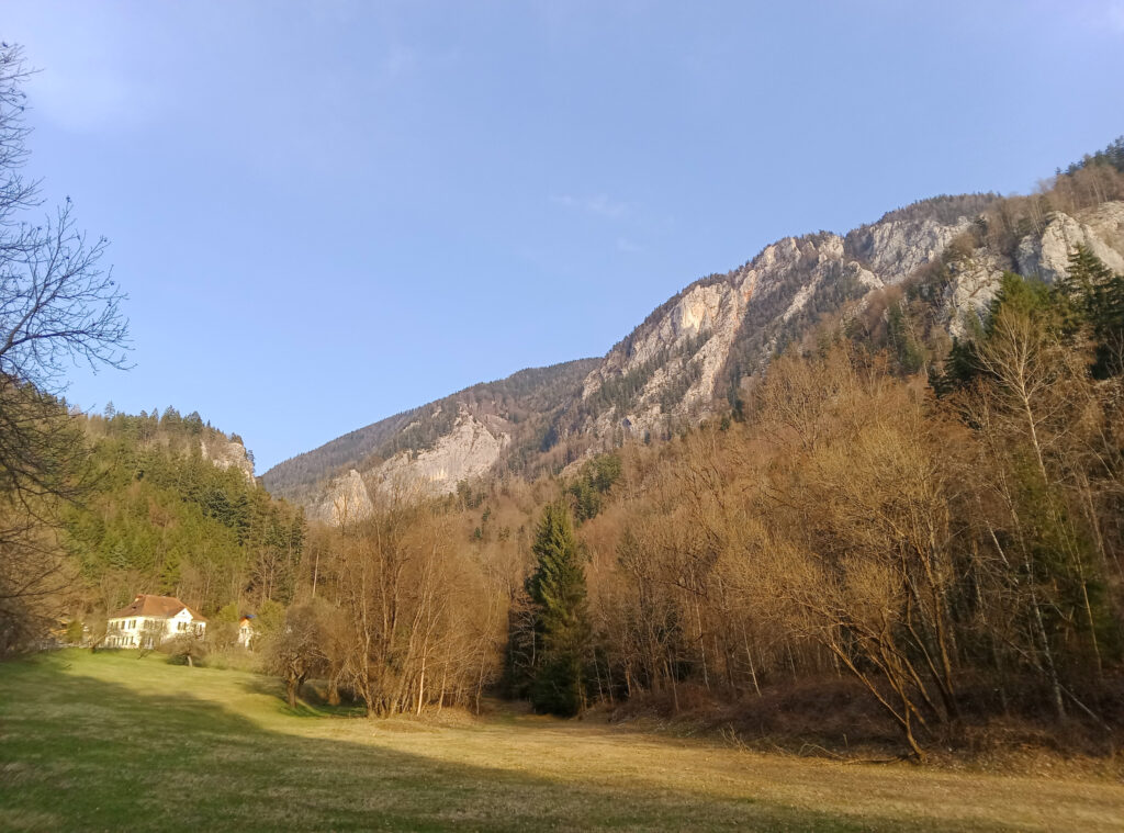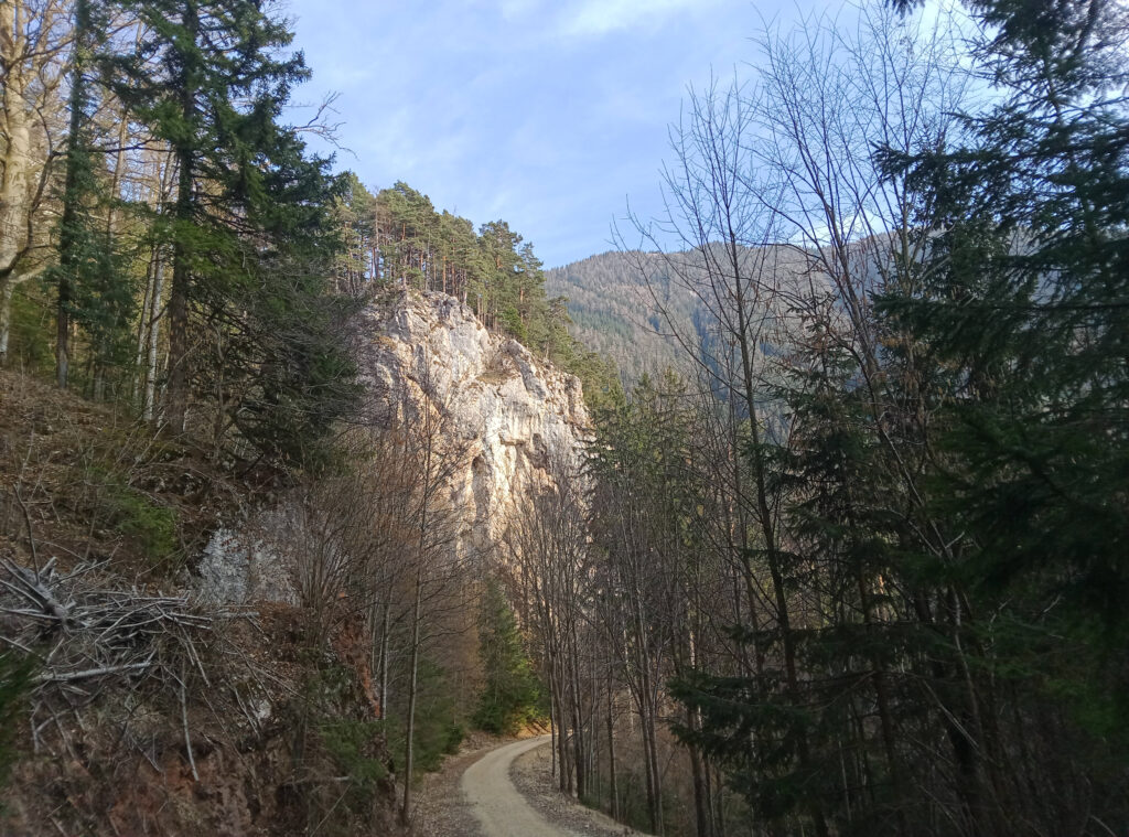 Schließlich erreiche ich das untere Ende der Bärenschützklamm. Von hier folgt der Weg nun wieder dem Verlauf des Mixnitzbachs, und auch im tief eingeschnittenen Tal liegt nun kein Schnee mehr, dafür bin ich inzwischen zu weit abgestiegen. Durch das enge Tal, vorbei an beeindruckenden Felswänden und über ein paar ziemlich schmale Brücken erreiche ich den Parkplatz der Klamm, etwas außerhalb von Mixnitz.
